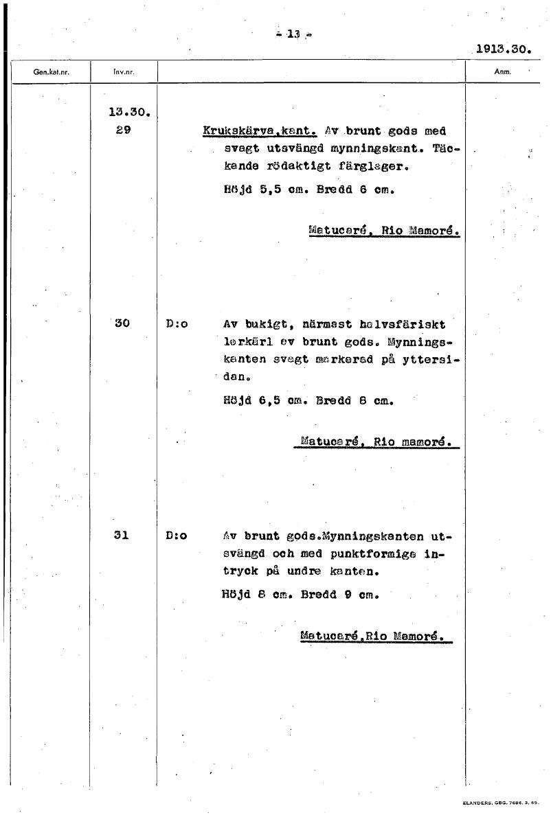 • 13 1913.30. 13.30. 29 Krukskärva.kent.. Av brunt gods med svagt utsvängd mynningskant. Täc- kende rödaktigt firglager. Böjd 5,5 cm. Bredd 6 cm. Matucarå, Rio ~ord. 30 D:o Av bukigt, närmast halvsfäris... Visa hela