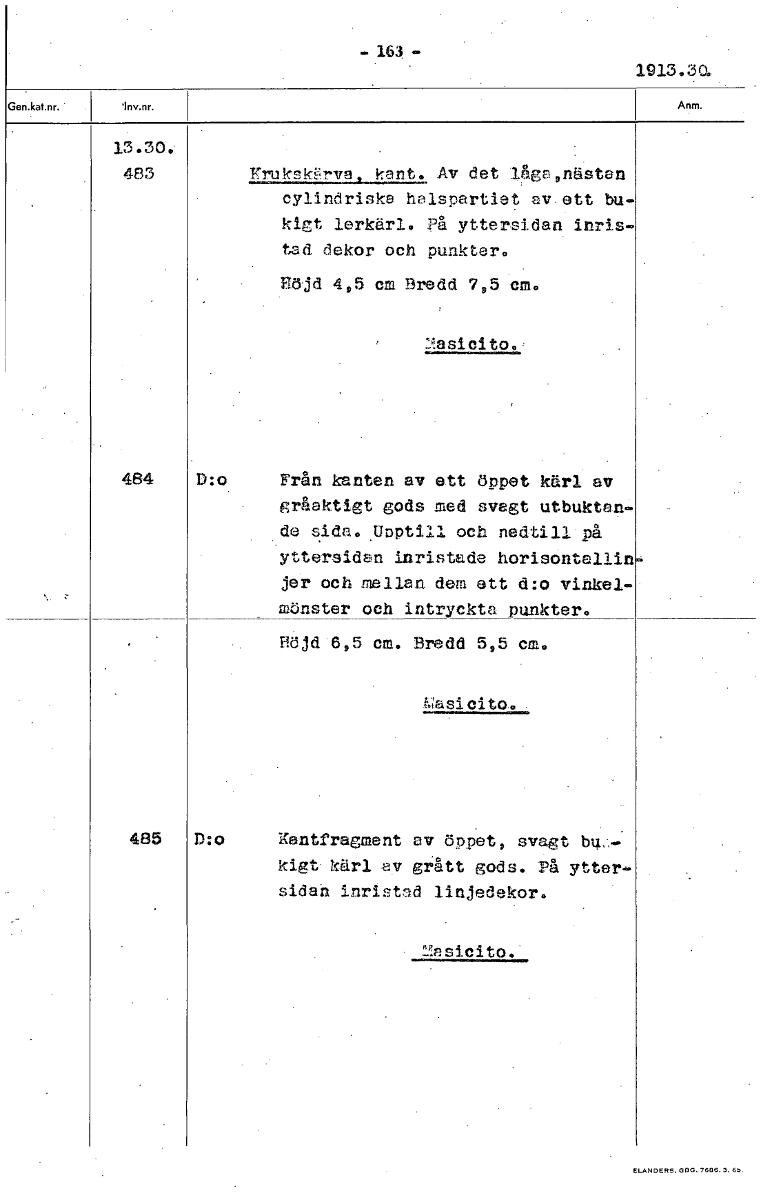 - 163. - 1913.30, 13.30.- 483 isyrulcsiE1113212D12 Av det låga ,nästan cylindriska haispartiet svett bu- kigt lerkärl. på yttersidan inris- tad dekor och punkter. Röjd 4,5 cm Bredd 7,5 cm. 2asicito., ...