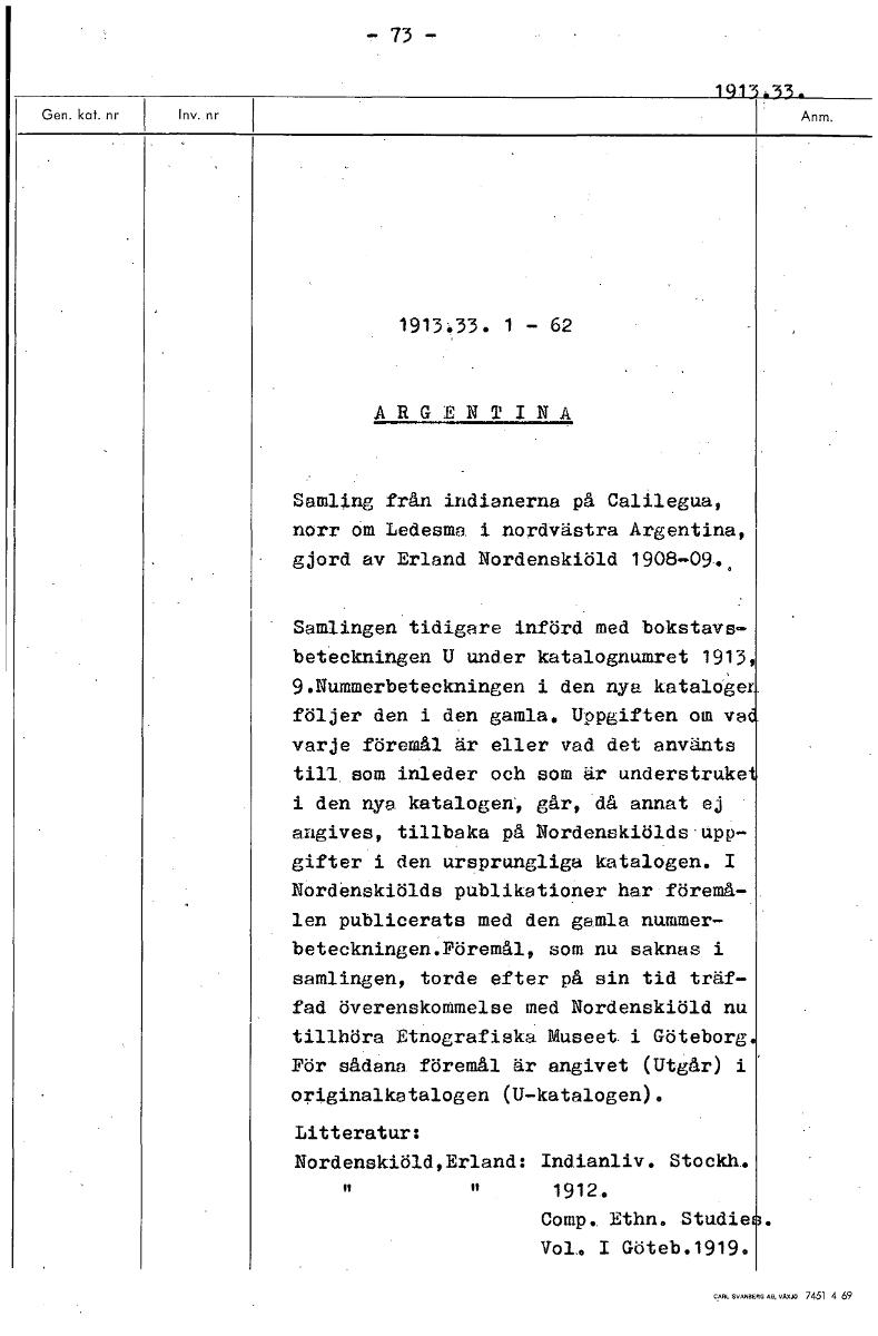 -73- 1913'33. 1913.33. 1 - 62 ARGENTINA Samling från indianerna på Calilegua, norr om Ledesma i nordvästra Argentina, gjord av Erland Nordenskiöld 1908-09.. Samlingen tidigare införd med bokstavs- beteckningen U under katalognumret 1913, 9.Nummerbeteckningen i den nya kataloger följer den i den gamla. Uppgiften om va• varje föremål är eller vad det använts till som inleder och som är understruke i den nya katalogen, går, då annat ej angives, tillbaka på Nordenskiölds upp- gifter i den ursprungliga katalogen. I Nordenskiölds publikationer har föremå- len publicerats med den gamla nummer- beteckningen.Föremål, som nu saknas i samlingen, torde efter på sin tid träf- fad överenskommelse med Nordenskiöld nu tillhöra Etnografiska Museet. i Göteborg För sådana föremål är angivet (Utgår) i originalkatalogen (U-katalogen). Litteratur: Nordenskiöld,Erland: Indianliv. Stockh. 1912. Comp.. Ethn. Studie Vol. I Göteb.1919. [ocr]