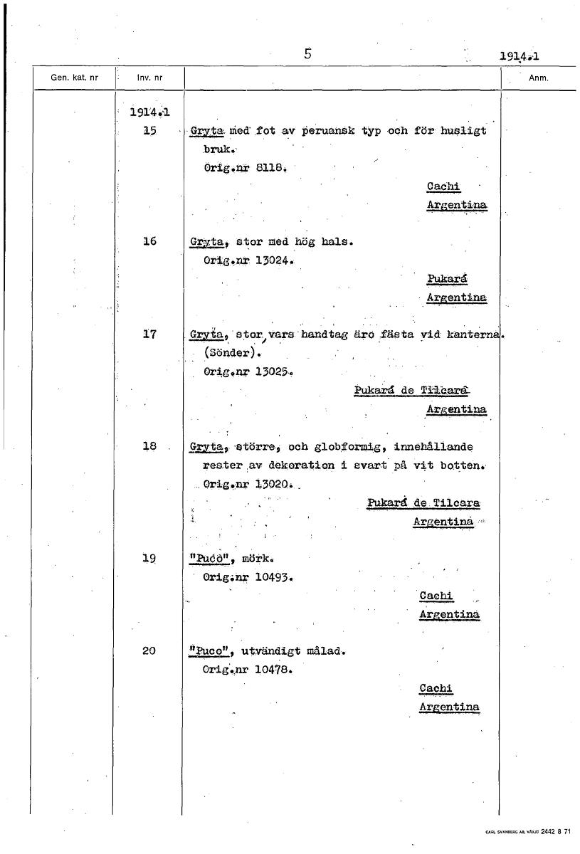 5 191.4.4 19144 15 Gryta. med' fot av peruansk typ och för husligt bruk. Orig.= 8118. Oachi A.tgentina 16 2219, stor med hög hals. orj43,nr 15024. Pukard Arjentina 17 Gryia9'stor/ vars'handtag äro fäs...Visa hela