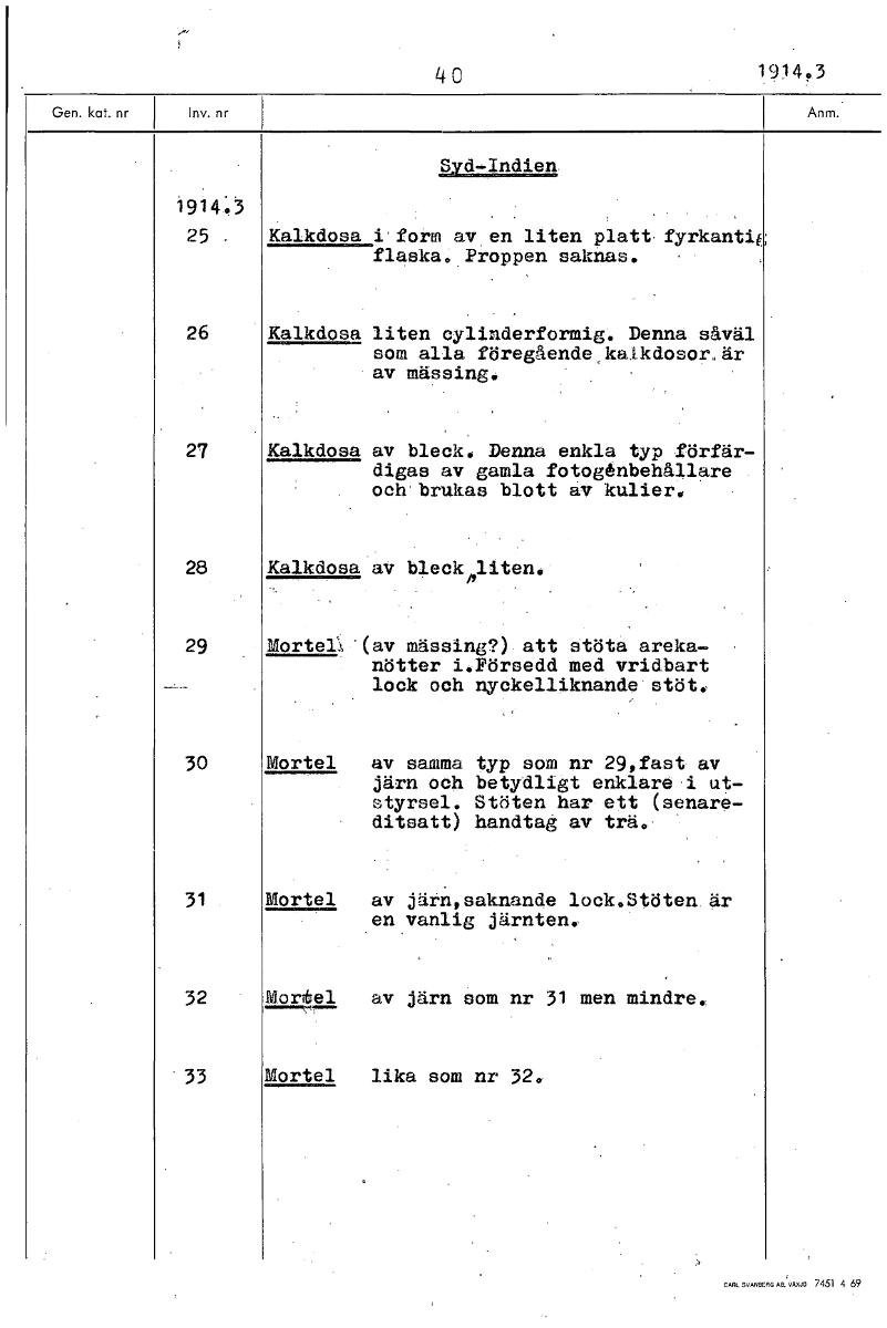 40 1914.3 S d Indien j9i4;5 25 alkdosa i form av en liten platt fyrkantig flaska. Proppen saknas. 26 Kalkdosaliten cylinderformig. Denna såväl som alla föregåendekalkdosor.är av mässing. 27 Kalkdosa, ...Visa hela