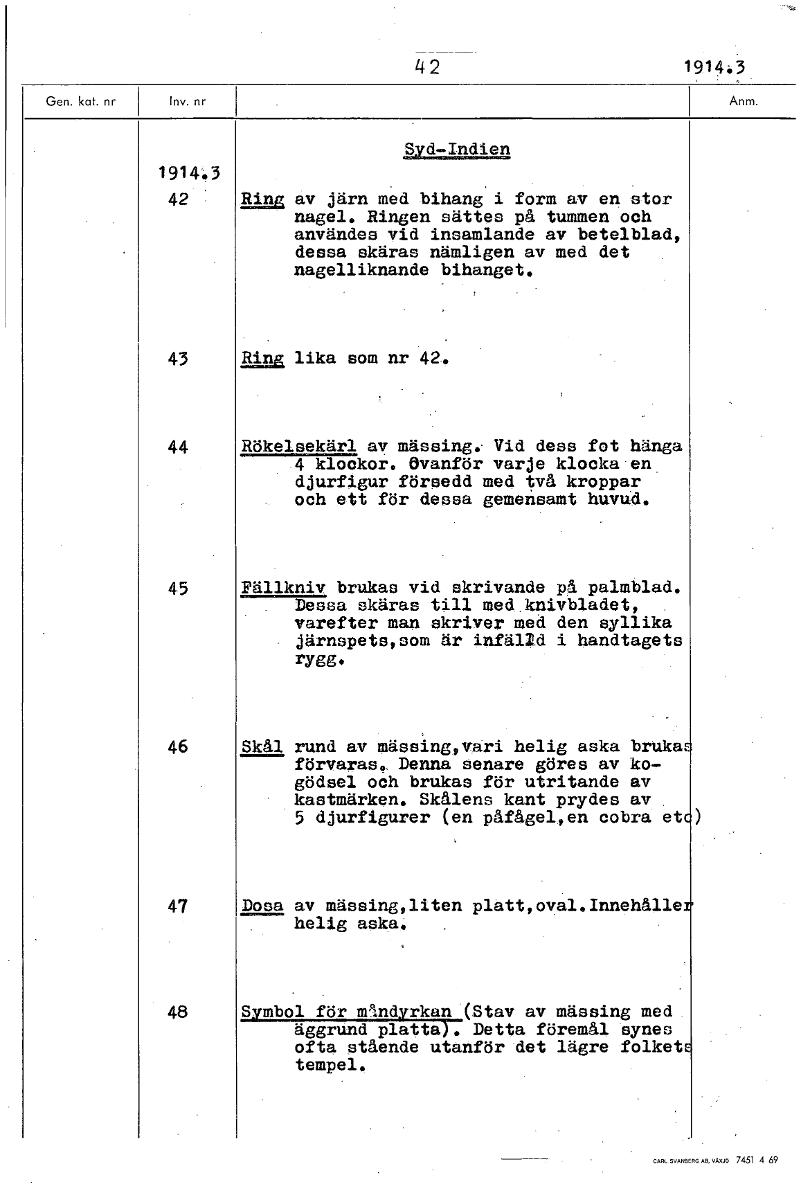 42 1914:3 1914.3 42 ' Ring av järn med bihang i form av en stor nagel. Ringen sättes på tummen och användes vid insamlande av betelbiad, dessa skäras nämligen av med det nagelliknande bihanget, 43 Ring lika som nr 42. 44 Rökelsekärl av mässing. Vid dess fot hänga 4 klockor. Ovanför varje klocka en djurfigur försedd med två kroppar och ett för dessa gemeåsamt huvud. 45 Fällkniv brukas vid skrivande på palmblad. Dessa skäras till med knivbladet, varefter man skriver med den sylliks järnspets, som är infälld i handtagets rygg. 46 Skål rund av mässing,vari helig aska bruka förvaras.. Denna senare göres av ko- gödsel och brukas för utritande av kastmärken. Skålens kant prydes av 5 djurfigurer (en påfågel,en cobra e 47 Dosa av mässing,liten platt,sval.Innehålle helig aska. 48 Symbol för mändyrkan (Stav av mässing med äggrund platta). Detta föremål synes ofta stående utanför det lägre folket tempel. [ocr]
