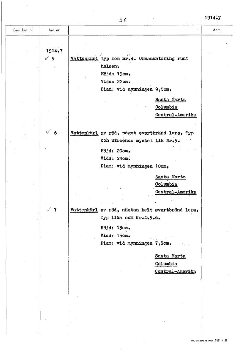 56 1914.7 1914.7 5 Vattenkärl typ Som nr.4. Ornamentering runt halsen'. Höjd: 19em. Vidd: 22Pm. Diam: vid mynningen 9 56m. Santa Marta Columbia CentralAmerika Vattenkärl av röd, något svartbränd lera. Typ och utseende mycket lik Nr5.' Höjds Mom. Vidd: 24cm: Diam: vid Mynningen 10cm. Santa Marta Columbia Central-Amerika Vattenkärl av röd, nästan helt svartbränd lera. Typ lika som Nr.4.5.6. Höjd: 13eM. Vidd: 15em, Diam: vid mynningen 7,5cm. Santa Marta Columbia Central-Amerika [ocr]Stäng