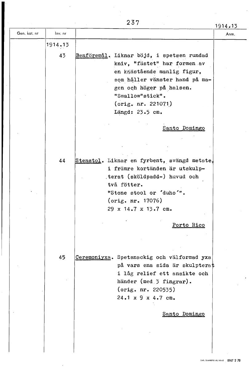 • 237 1914.13 1914.13 43 Benföremål. Liknar böjd, i spetsen rundad kniv, "fästet" har formen av en knästående manlig figur, som håller vänster hand på ma- gen och höger på halsen. "Swallow"stick". (orig... Visa hela