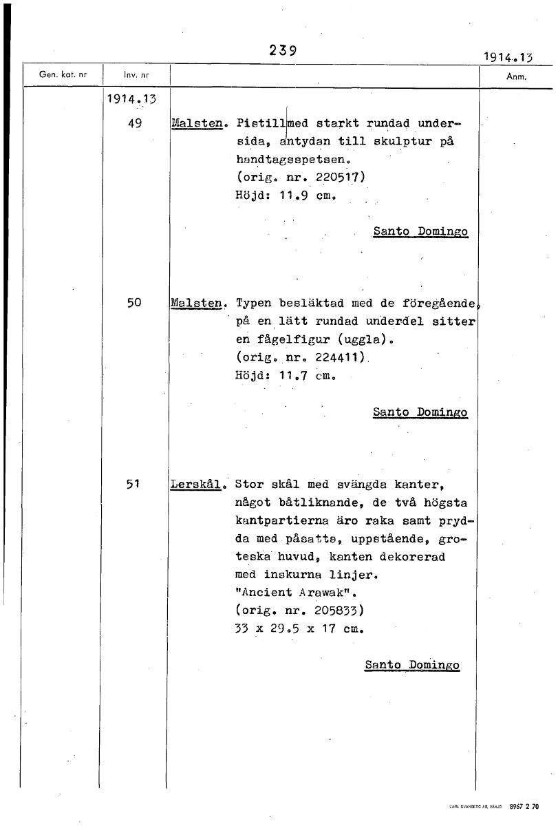 239 1914..13 1914.13 49 Malsten. Pistillmed starkt rundad under- sida, antydan till skulptur på handtagsspetsen. (orig. nr. 220517) Höjd: 11.9 cm. Santo Domingo 50 Malsten. Typen besläktad med de före...Visa hela