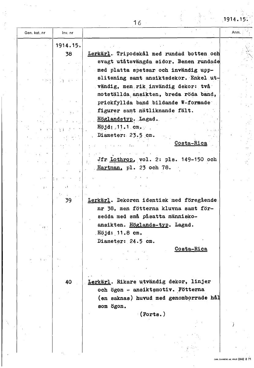 • 16 1914.15 1914.15. 38 Lerkärl. Tripodskål med rundad botten °c svagt utåtsvängda sidor. Benen rundad med platta spetsar och invändig upp- slitsning samt ansiktsdekor. Enkel ut vändig, men, rik invänd... Visa hela