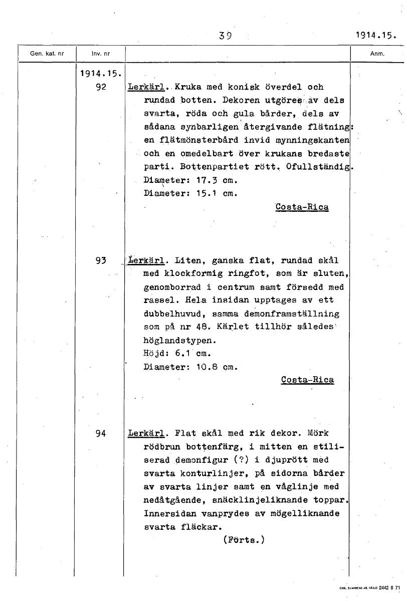 39 1914.15. 1914.15. 92 Lerkärl. Kruka med konisk överdel och rundad botten. Dekoren utgöres av dels svarta, röda och gula bårder, dels av sådana synbarligen återgivande flätning en flätmönsterbård invid mynningskanten och en omedelbart över krukans bredaste parti. Bottenpartiet rött. Ofullständig Diameter: 17.3 cm. Diameter: 15.1 cm. Costa-Rica 93 Lerkärl. Idten, ganska flat, rundad skål med klockformig ringfot, som är sluten, genomborrad i centrum samt försedd med rassel. Hela insidan upptages av ett dubbelhuvud, samma demonframställning som på nr 48. Kärlet tillhör således höglandstypen. Höjd: 6.1 cm. Diameter: 10.8 cm. Costa-Rica 94 Lerkärl. Fiat skål med rik dekor. Mörk rödbrun bottenfärg, i mitten en stili- serad demonfigur (?) i djuprött med svarta konturlinjer, på sidorna bårder av svarta linjer samt en våglinje med nedåtgående, snäcklinjeliknande toppar. Innersidan vanprydes av mögelliknande svarta fläckar. (Förts.) [ocr]