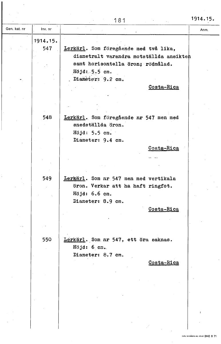 181 1914.15. 1914.15. 547 Lerkärl. Som föregående med två lika, diametralt varandra motställda ansikte samt horisontella öron; rödmålad. Höjd: 5.5 cm. Diamker: 9.2 cm. Costa-Rica 548 Lerkärl. Som föregående nr 547 men med snedställda öron. Höjd: 5.5 cm. Diameter: 9.4 cm. Costa-Rica 549 Lerkärl. Som nr 547 men med vertikala öron. Verkar att ha haft ringfot. Höjd: 6.6 cm. Diameter: 8.9 cm. Costa-Rica 550 Lerkärl. Som nr 547, ett öra saknas. Höjd: 6 cm. Diameter: 8.7 cm. Costa-Rica [ocr]Stäng