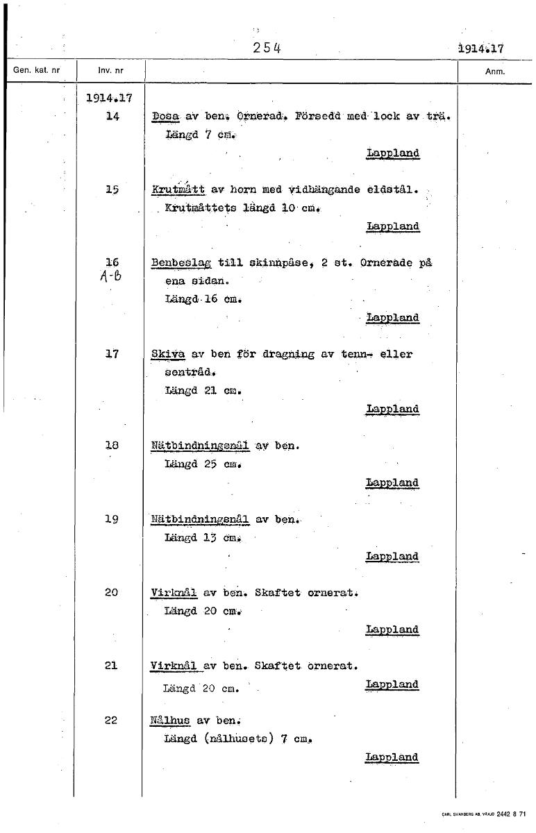 254 - 19141.17.. 1914.17 14 Doa av ben i ötnerad. Försedd med .lock av trä. längd 7 gm:. piand 15 Krutmått av horn med vidhängande eldstål. . KrutPåttets långd 10 cm, Lappland Benbeslag till skinnpåse, 2 et. Ornerade på ena sidan- . Längd 16 cm. 1517 Skiva av ben för dragning av tenn eller sentråd. Längd 21 cm. 12222land av ben. Längd 25 cm. Lappland 19 NätbindningA1911 av ben. Längd 13 cm. Lappland 20 Virknål av ben. Skaftet ornerat, Längd 20 cm.' Lappland. 21 Virknål av ben. Skaftet ornerat. Lappland 22 Nålhus av ben. Längd (nålhusets) 7 cm. Lappland [ocr]Stäng