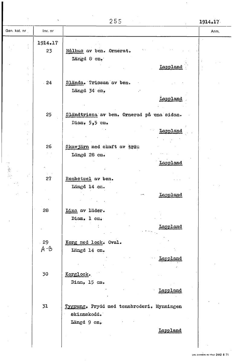 • 2 5 5 1914.17r 1914.17 23 Nålhud av ben. Ornerat. Längd 8 cm.- Lappland 24 Slända. Trissanav ben. ',ängd 34 cm. lapPland , 25 SIändtrissa:av ben. Ornerad på-ena.sidan. Diam. 595 tm• Lappland 26 211..Y... Visa hela