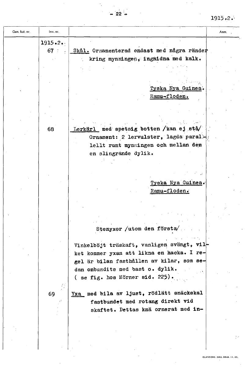 -2 1915 1915.20: 67 Skål. Ornamenterad endast med några rände kring mynningen, ingnidna med kalk, TYske!!._11£2212.13tä'e Ramufloden. 68 Lerkärl med'spetsig botten /kan ej stå/ Ornament :2 lervulster,...
