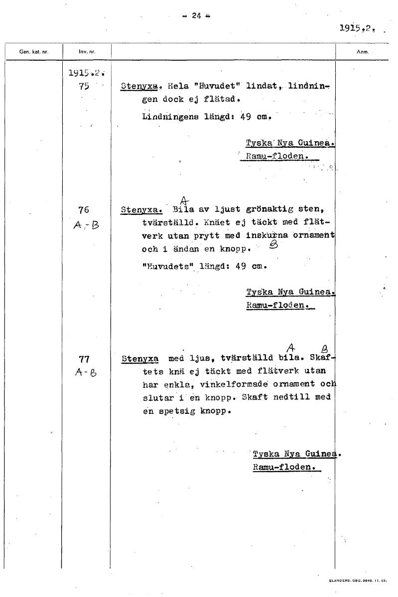 24 1915.2. 1915424 75 Stenyxa. Hela "Huvudet" lindat,. lindnia- gen dock ej flätad. Lindningens längd: 49 cm. fiAlsä4u21Antg. Famn-floden. 76 Stenyxa. Bila av ljust grönaktig sten, tvärställd. Knäet e...Visa hela