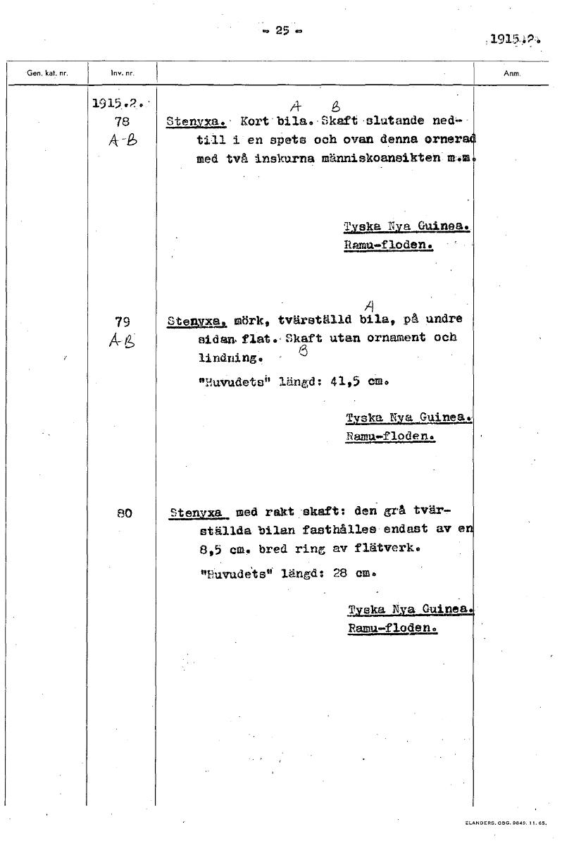 • 25 . ,1915å2-. 6 78 Stenyxa. Kort bila. Skaft slutande ned- 4-6 till i en spets och ovan denna orner med två inskurna människoansikten m. Tyska r4ya Guinea. Ramu-floden. 1 79 Steiyx 4$rk, tvärställd b... Visa hela
