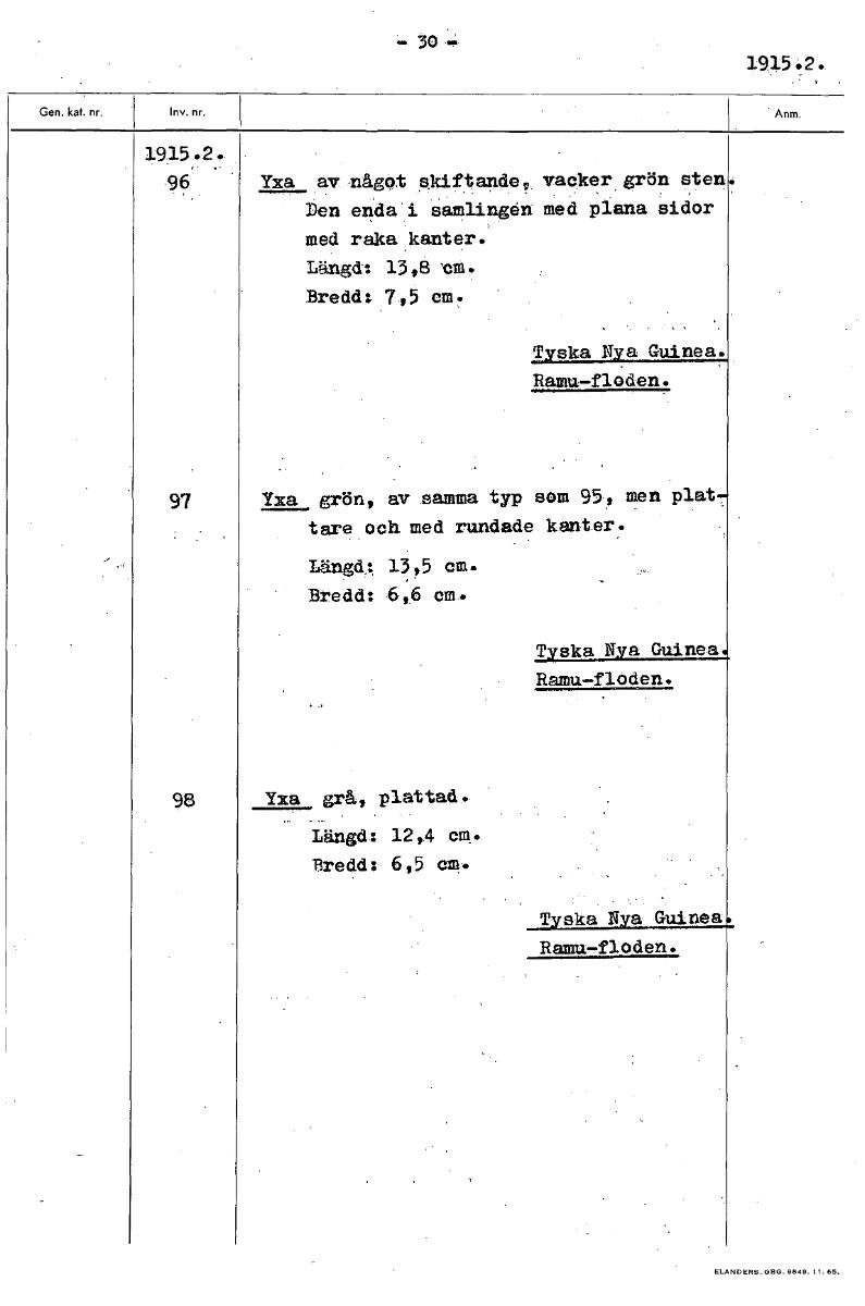 • - 30 1915.2. 1915.2 96 Yxa av något skiftande, vacker grön sten Den endal. Samlingen med plana sidor med raka kanter. Längd: 13,8 'cm. Bredd: 7,5 cm. Tyska Nya Guinea. Rama-f10 den. 97 Yxa grön, av sa... Visa hela