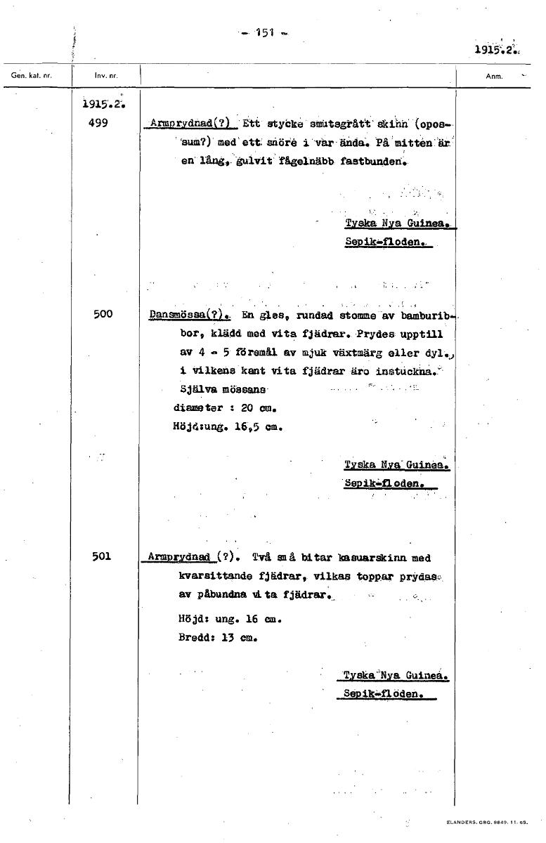 • - 151 - 1915:2i, 1915.2. 499 A ruin rydnad(?) Ett stycke ståtegtått• skihn (opos- sum?) med' ett snöre i vår ända. På'mitten. iir en lång,. gulvit fågelnäbb fastbunden. T ska N a Guinea. Sepik-flode...Visa hela