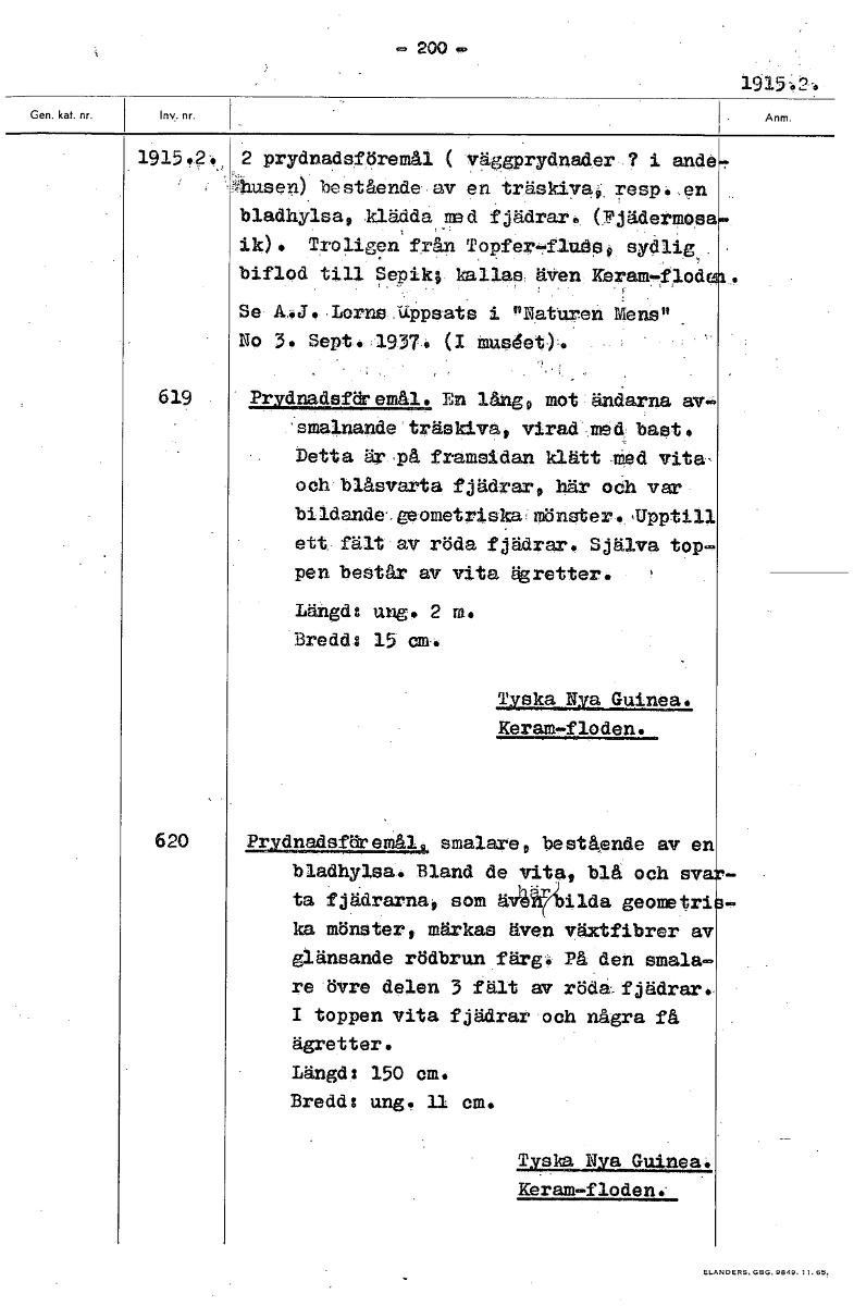 200 1915.2. 1915.2., 2 prydnadsföremål ( väggprydnader .7 i ande 4husen) begtående.av en träskiva,. resp..an bladhylsa, klädda med fjädrar. (Pjädermosa ik). Troligen'frin Topfer,rfluåp, sydlig, biflod till Sepik; kallas även Iferam-.flod Se A.J..LornshUppsats i "Naturen Mena" . No 3. Sept. ;1937. (1. Musdet). 619 Prydnadsföremål. En lång, mot.ändarna av. 'smalnande 'träskiva, viradmsd. batat. Detta är .på framsidan klätt td,!sd vita- och blåsvarta fjädrar, här och var bildande-,cgometriska,mönster. 'Upptill ett fält av röda fjädrar. Själva top. pen består av vita 4gretter. Längd: ung. 2 m. Bredd: 15 an. Tyska Nya Guinea. Keram,0floden. 620 1112ängälkamål smalare, be stående av en bladhylsa. Bland de vita, blå och sv ta fjädrarna, som äVUSilda geometri ka mönster. även växtfibrer av glänsande rödbrun färg. På den smala- re övre delen 3 fält av rödafjädrar.i 1 toppen vita fjädrar och några få ägretter. Längd: 150 cm. Bredd: ung. il cm. Tyska Nya Guinea. Keram-floden.- [ocr]
