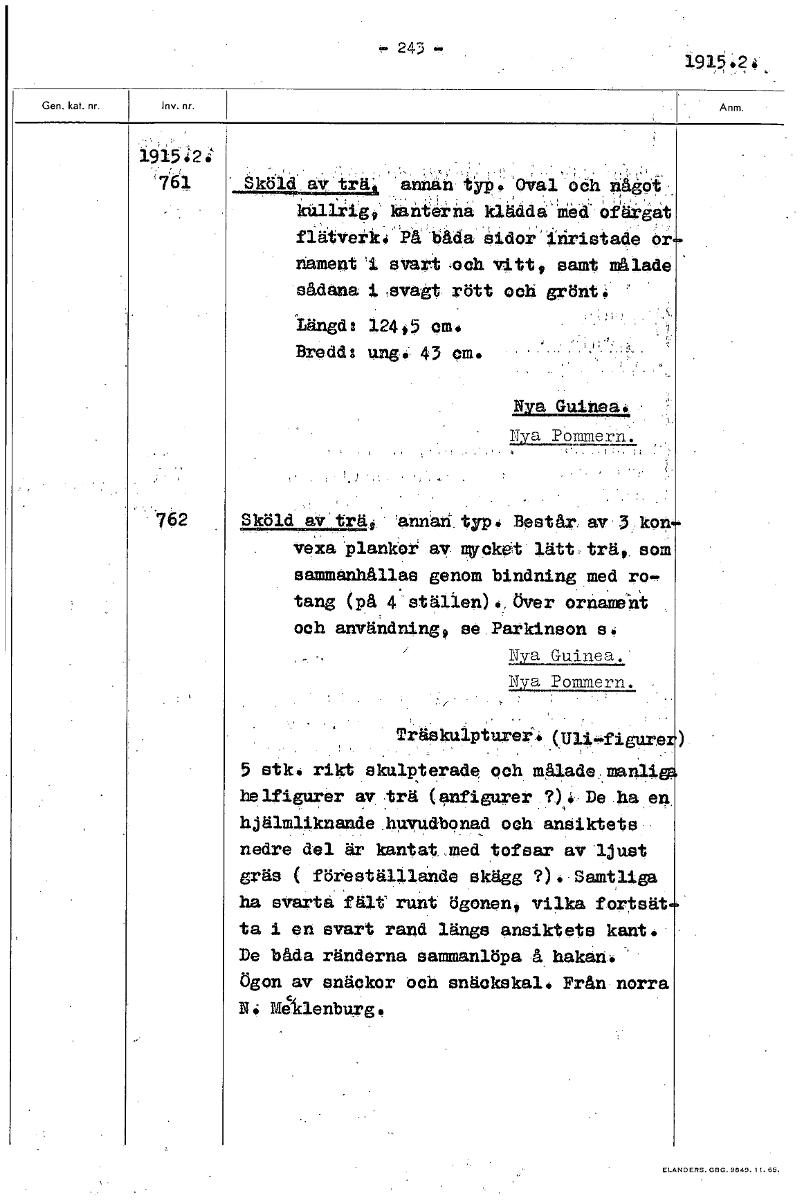 243 .- 19l5.2å, 761 Sköld jutth annan tyt. :Oval och något kullrig, 1anterna klädda med ofbrgat flätverk På' båda eidoi»nristadeor nament 'i svart .och vitt, samt, målade sådana i ,svagt rött och grönt: 'Längd: 124,5 cm. Bredda ung. 43 cm. Nya Guinea. E/s2.212422.nn2.. 162 Sköld av trä s; SåriarIL typ Består av 3 . kon vexa plankor av mycket lätt, trä,. som sammanhållas genom bindning med ro-, tanz (på 4' ställen) över ornaåee'å och anvähdning9 se Parkinson s Nya Guinea.' Nya Pommern. Träskulpturer •CUlimfigure 5 stk. rikt skulpterade och målade manli helfigurer av trä (figurer ?). De ha en hjälmliknande huvudbonad och ansiktets nedre del är kantat med tofsar av ljust gräs ( föreställlande skägg ?) Samtliga ha svarta fält' runt ögonen, vilka fortsät ta i en svart rand längs ansiktets kant. De båda ränderna sammanlöpa å hakan. ögon av snäckor och snäckskal. Från norra N Malenburg [ocr]
