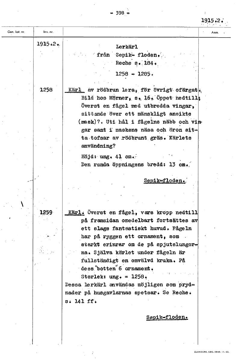 - 398 1915:2 1915.2., Lerkärl från Sepik..f1oden., Reche 9. 1840 1258 - 1285. 1258 Kärl ev rödbrun lera, för övrigt. ofärgat Bild hos M5rner 0, s, 16 k, öppet' nedtill.; överst en fågel med utbredda v...