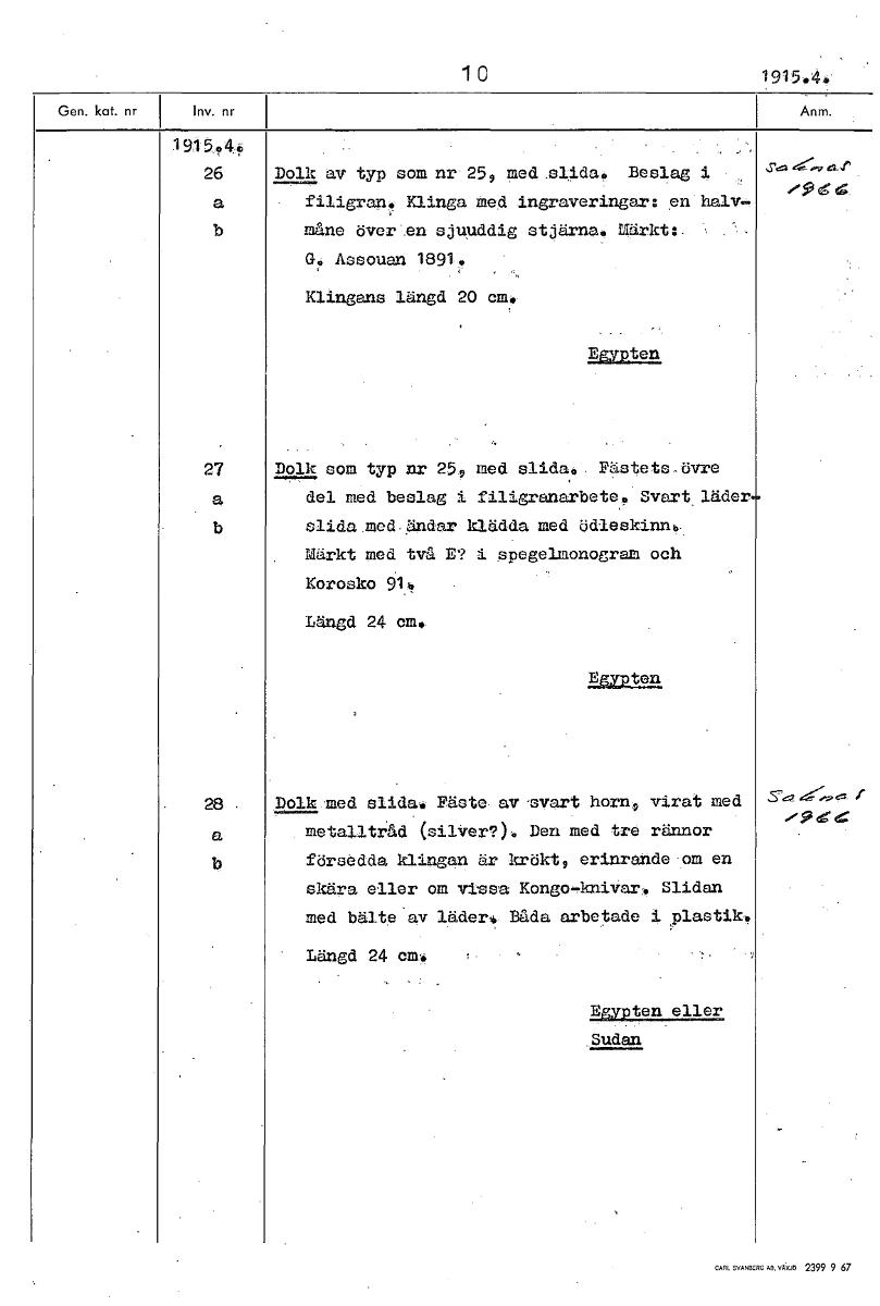 10 1915.4. 19150, 26 Dolk av typ som nr.259 med .slida, Beslag i a filigran, Klinga med ingraveringar: en hal.w. b måne överen sjuuddig stjärna. Märkt:— G.; Assouan 1891, Klingans längd 20 cm, Egypten 27 Dolk som typ nr 25, med slida, Fästetsövre a del med beslag i filigranarbetey, Svart läder b slida med ändar klädda med ödleskinn. Märkt med två E? i spegelmonogram och Korosko 916 Längd 24 cm, pien 28 Dolk med slida. Fäste av, evart horn, virat med a metalltråd (silver?). Den med tre rännor b försedda klingan är krökt, erinrande om en skära eller om vissa Kongo-knivar. Slidan med bälte'av läder. Båda arbetade i plastik» Längd 24 cm, Egypten eller Sudan [ocr]