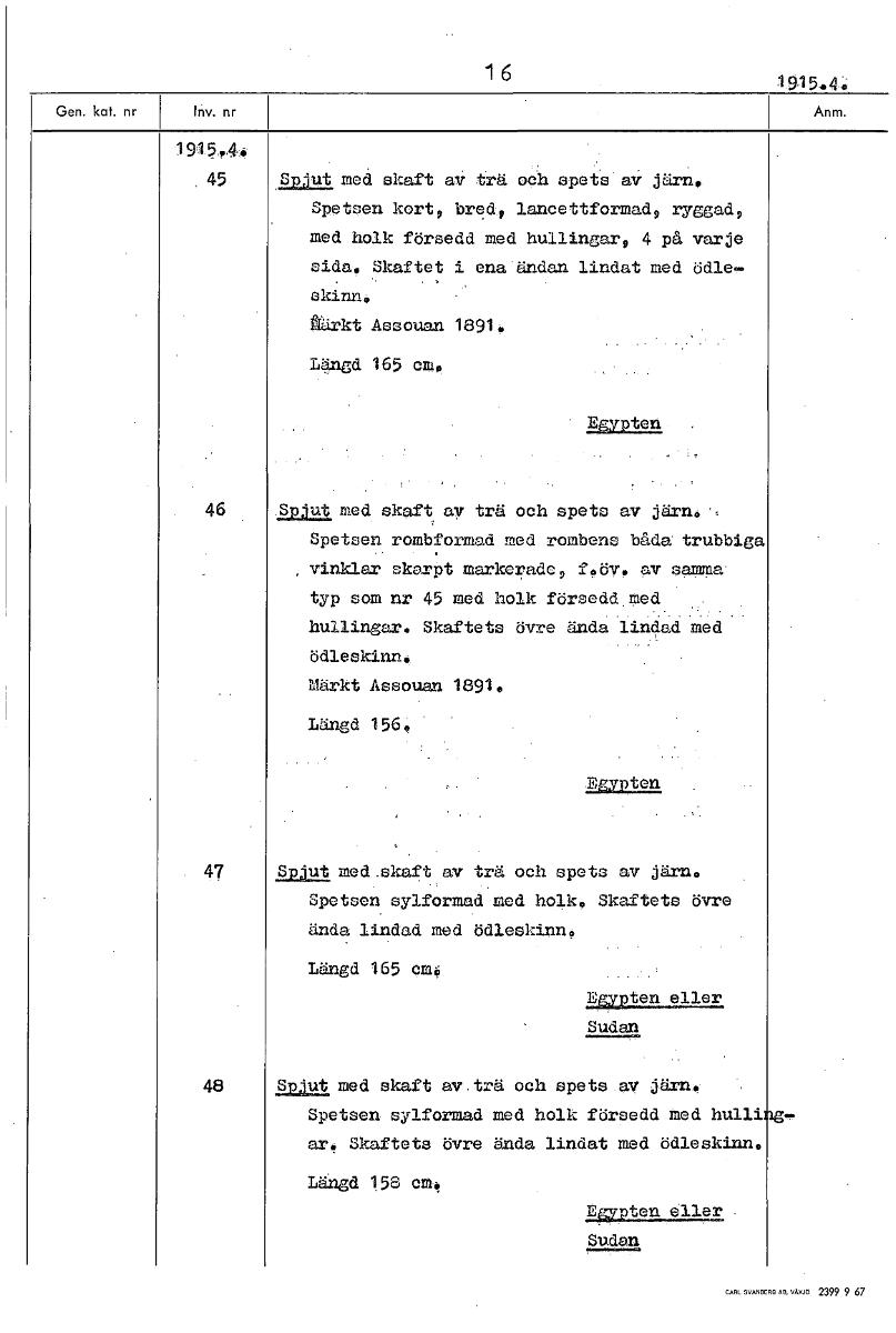 16 191544‹; 19115,?.4:¥ 45 ;,,ljut med skaft av trä och spets av järn, Spetsen kort, bred, lancettformad, ryggad, med holk försedd med hullingar, 4 på varje sida. Skaftet i ena ändan lindat med ödlein...