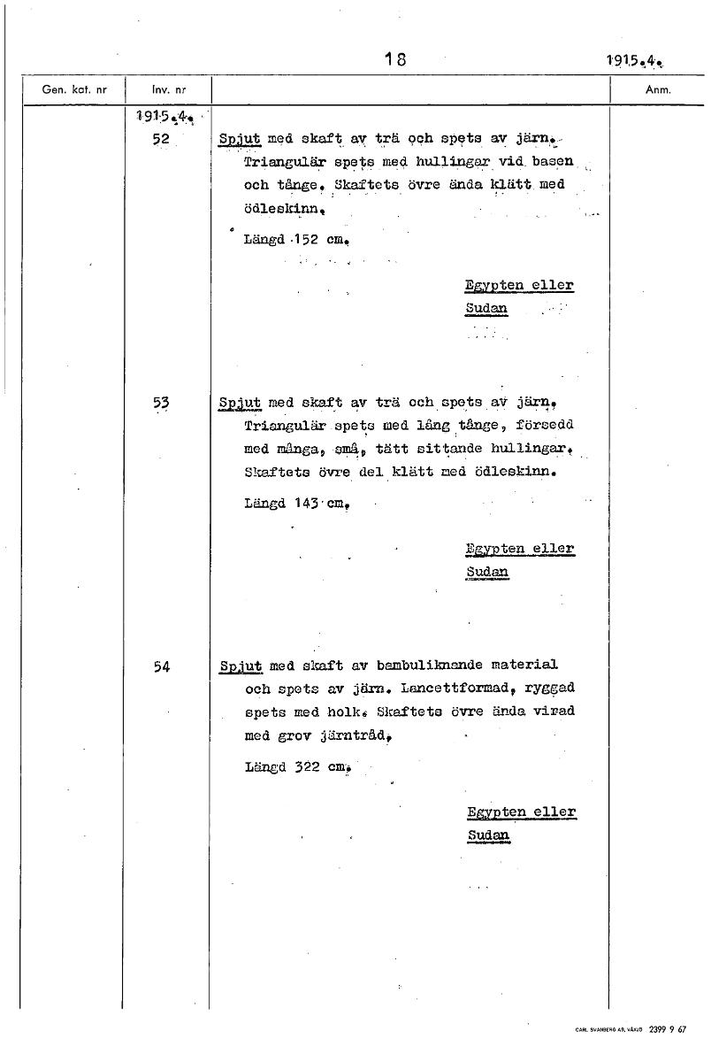 18 i 91:5 tk, 52 Spjut med skaft, av trä och spets av järn...- Triangulär spets med hullingaryid.basen. och tånge. Skaftets övre ända klätt. med ödleskinn, Längd -152 cm. aypten eller Sudan 53 Spjut med skaft av trä och spets av järn, Triangulär spets med lång tånge, försedd med många, små, tätt sittande hullingar. Skaftets övre del klätt med ödleskinn. Längd 143.cm, I�;fypten eller udan 54 Spjut med skaft av bambuliknande material och spets av järn. Lancettformad, ryggad spets med holk, Skaftets övre ända virad med grov järntråd, Längd 322 cm. åämtsulAkkIn Sudan [ocr]