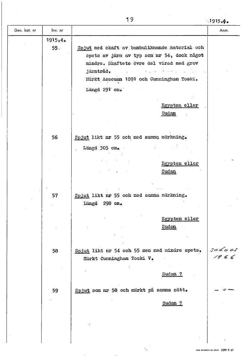 19 19154. 1,9154o 55 Slim/ med skaft av bambuliknande materies.. och spets av järn av typ som nr 549 dock något mindre. Skaftets.övre del virad med grov järntråd. Märkt Assouan 1891 och Cunningham Toski. Längd 291 em. Egypten eller Sudan 56 2214. likt nr 55 och med samma märkning. Längd 305 cm. Egypten eller Sudan 57 Spjut likt nr 55 och med amma märkning. Längd 298 cm. Egypten eller Sudan 58 Spjut likt nr 54 och 55 men med mindre spets. Märkt Cunningham Toski. V. Sudan ? 59 lajulsom nr 58 och märkt på samma sätt. Sudan [ocr]Stäng