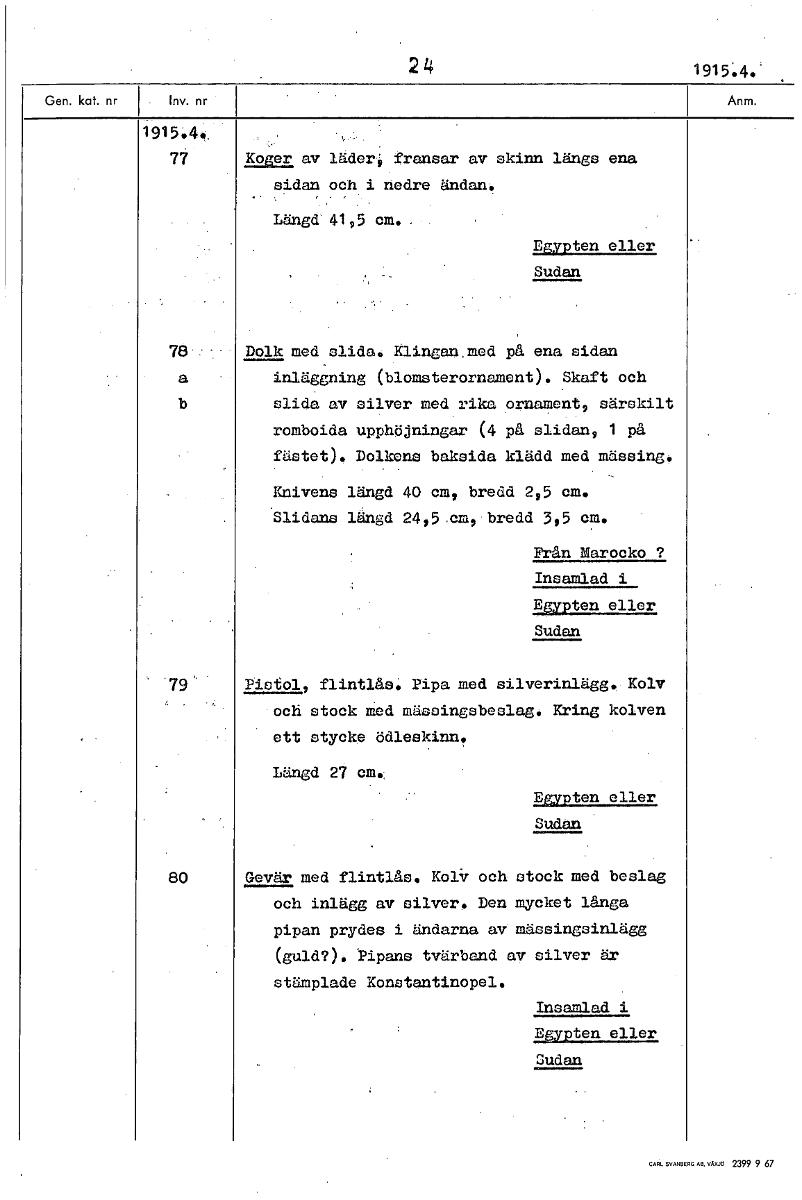 24 1915.4. 1915.4 77 Ko er av läder fransar av skinn längs ena sidan och i nedre ändan. - . Längd 4195 cm.. Egypten eller Sudan 78 Dolk med slida. Klingan,med på ena sidan a inläggning (blomsterorname...Visa hela