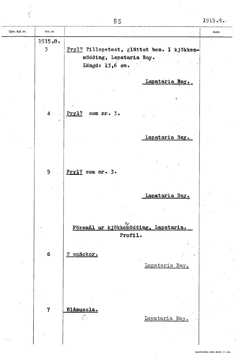 55 1915.3.. 1915.8., 3 Pryl? Tillspetsat, glättat ben. I kjökken, mödding, Lapataria Bay. Längd: 13;6 om. Lapataria Bay. 4 Pryl? som nr. 3. Lapataria Bay. 5 Pryl? som nr. 3. Lapataria Bay. Föremål ur kjökkemddding, Lapataria. Profil. 2 snäckor. Lapataria Bay. Blåmussla. Lapataria Bay. [ocr]