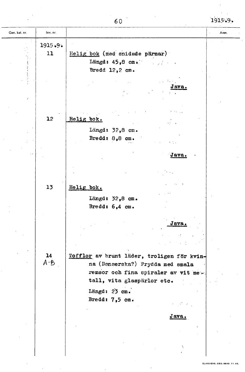 • 60 19i5-91 11 Helig bok (Med: snidade pärmar) Längd: 45,8 anå. Bredd 12,2 cm. Java. 12 Hell: bok. Längd: 32,8 cm. Bredd: 8,8 cm. Java. 13 Helig bok. Längd: 32,8 cm. Bredd: 6,4 em. Java. 14 Tofflor av ... Visa hela