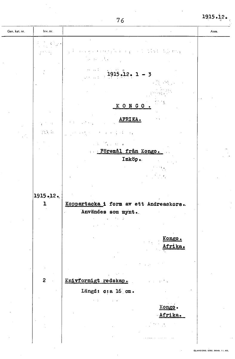 • 1915.12.. 1915.12. 1 — 3 KONGO. AFRIKA. : Föremål från Kongo. Inköp 1915 .12., 1 Koppartacka i form av ett Andreaskors., Användes som mynt. Konsol Afrika. 2 Knivformigt.redskap.: , Längds osa 16',om. ... Visa hela