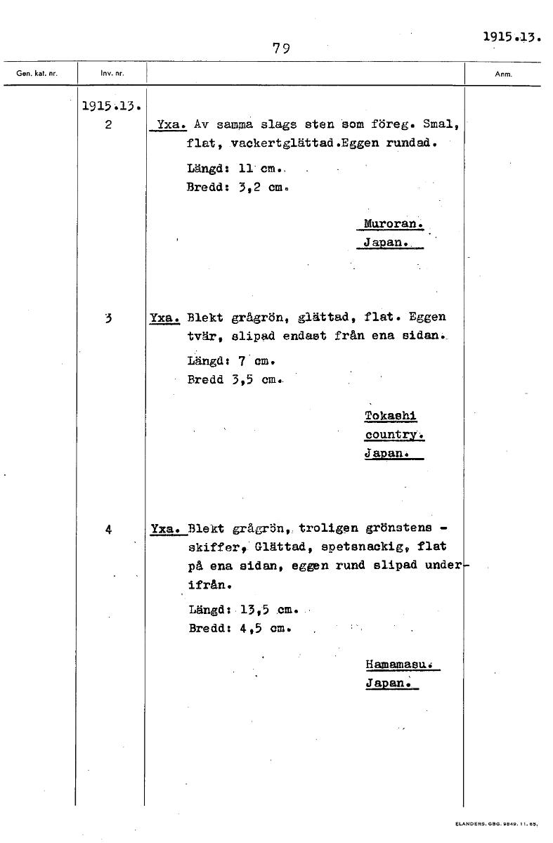 1915.1 . 79 1915.13. 2 Yxa. Av samma slags sten som föreg. Smal, flat, vackert glätt ad .Eggen rundad. Längd: 11 cm. Bredd: 3,2 cm. Muroran. Japan. 3 Yxa. Blekt grågrön, glättad, flat. Eggen tvär, slipad endast från ena sidan. Längd: 7.cm. Bredd 3,5 cm. Tokashi countr Japan. 4 Yxa. Blekt grågrön, troligen grönstens skiffer, Glättad, spetsnackig, flat på ena sidan, eggen rund slipad under ifrån. Längd: 13,5 .cm.. Bredd: 4,5 cm. Hamamasu: Japan. [ocr]