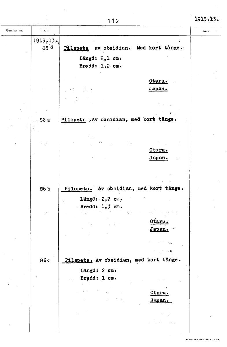 • 1 1 2 1915.13 191.5.g.3. 85'd Pilspets av obsidian., Med kort tånge. Längds 2,1 em. Bredd: 1,2 om. Otaru. Japan. 86 a Pilspets ,.Av obsidian, med kort tånge. Otaru. Japan. 86 b Pilspets. Av obsidian, ... Visa hela