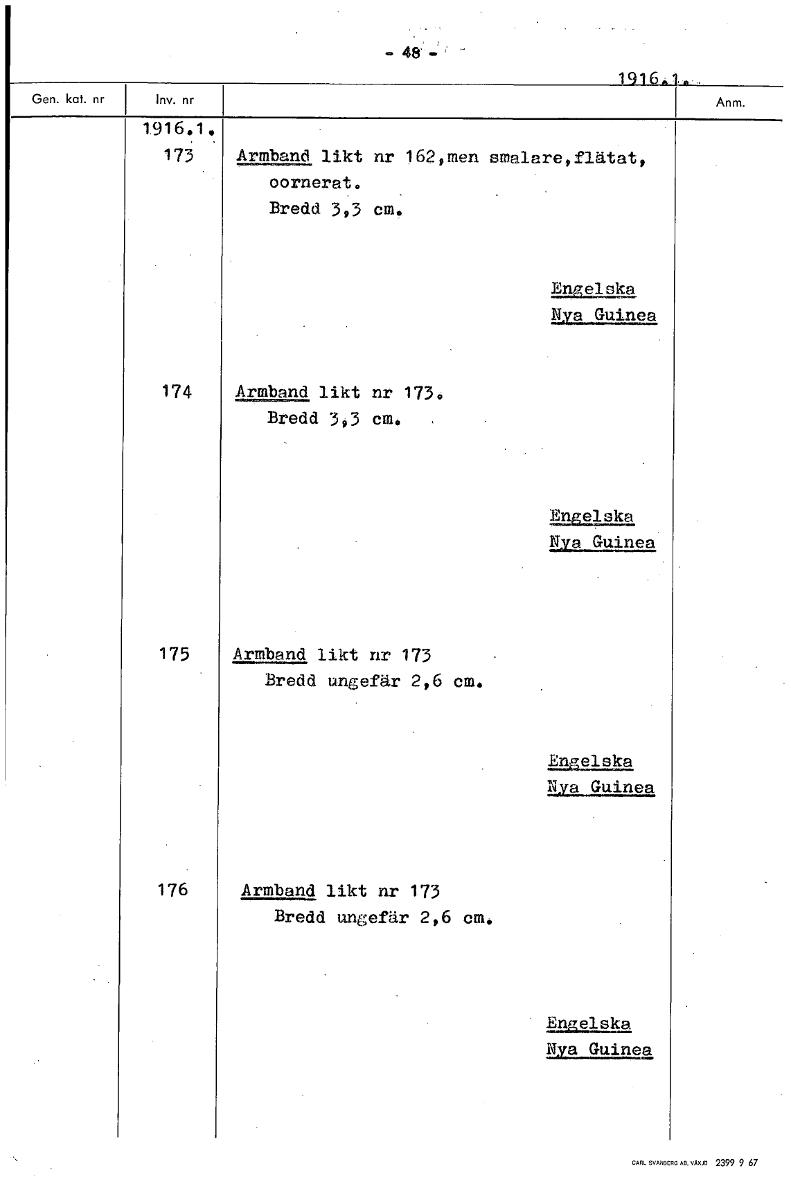 • - 48._ 1916.1. 19 1 6 . 1 . 173 Armband likt nr 162,men smalare flätat, oornerat. Bredd 3,3 cm. än-m2121g Nara Guinea 174 Armband likt nr 173. Bredd 393 cm. ängel ak Nya Guinea 175 Armband likt nr 173... Visa hela