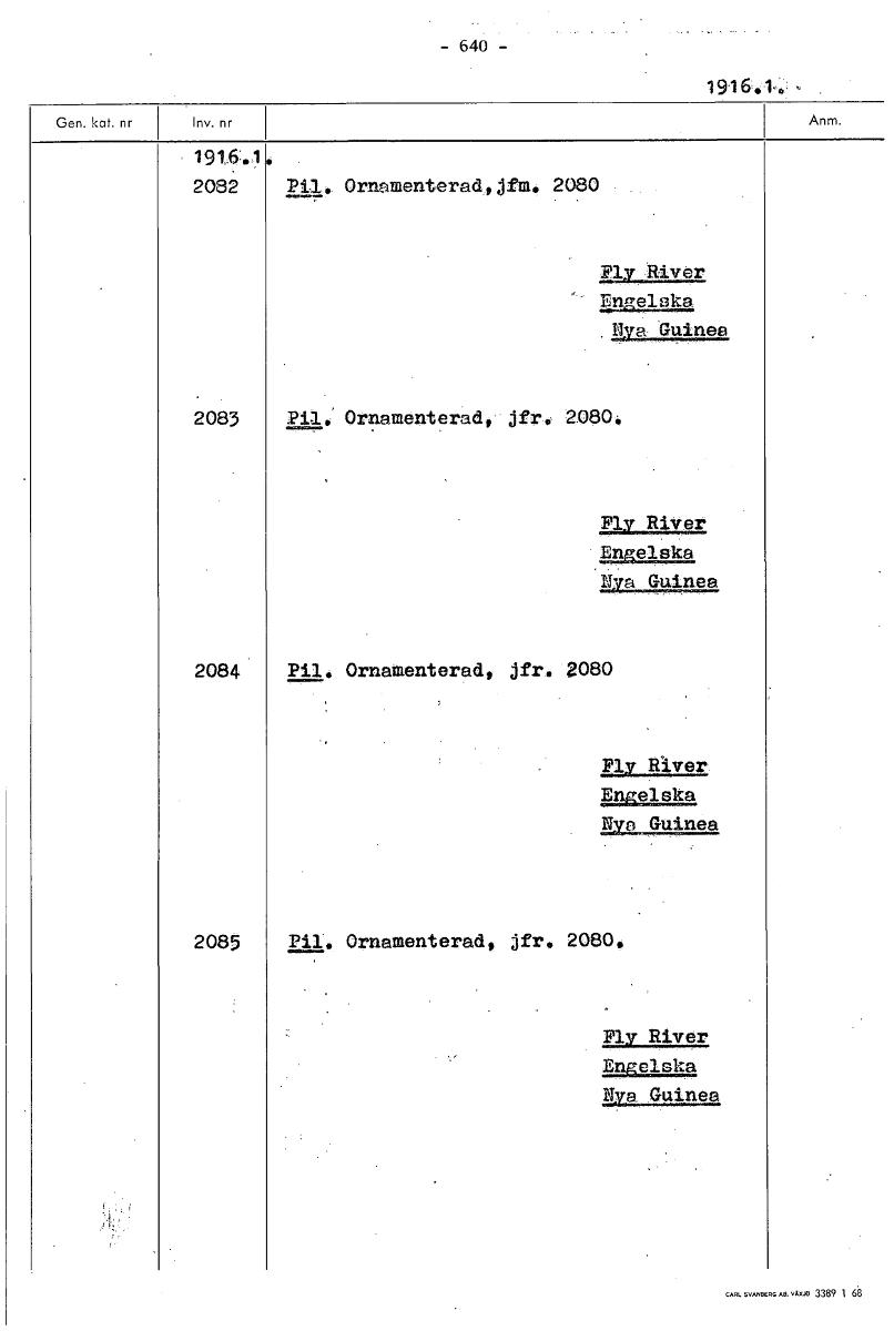 — 640 — 1916,1,, , 191.6..1 2082 Pil, Ornamenteradjoifm, 2080 Ply River EnnaElle Rya Guinea 2083 Pil; Ornamenterad, jfr, 2080, Fly River Engelska tra Guinea 2084 Pil, Ornamenterad, jfr. 2080 ny River ...