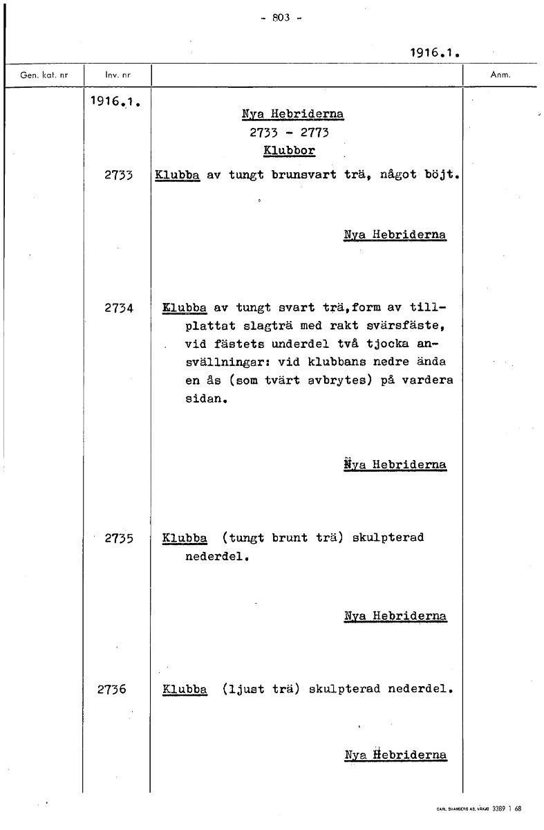 — 803 — 1916.1. 1916.1. N.ya Hebriderna 2733 - 2773 Klubbor 2733 Klubba av tungt brunsvart trä, något böjt. Nya Hebriderna 2734 Klubba av tungt svart trä,form av till- plattat slagträ med rakt svärsfä...Visa hela