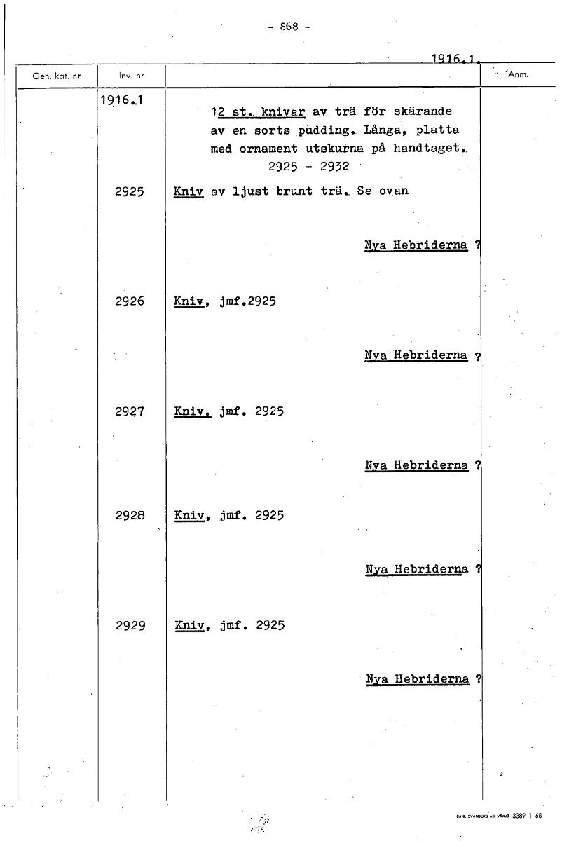868 1916.1, 1916,1 12 st., knivar av trä för skärande av en sorts .pUdding. Långa, platta med ornament utskutna på handtaget, 2925 - 2932 • 2925 Kniv av ljust brunt trä. Se ovan Nya Hebriderna 2926 Kniv, jmf.2925 Nya Hebriderna 2927 Kniv, jmf.. 2925 Nya Hebriderna 2928 Kniv, jmf. 2925 Nya Hebriderna 2929 Kniv, jmf. 2925 Nya Hebriderna ? [ocr]