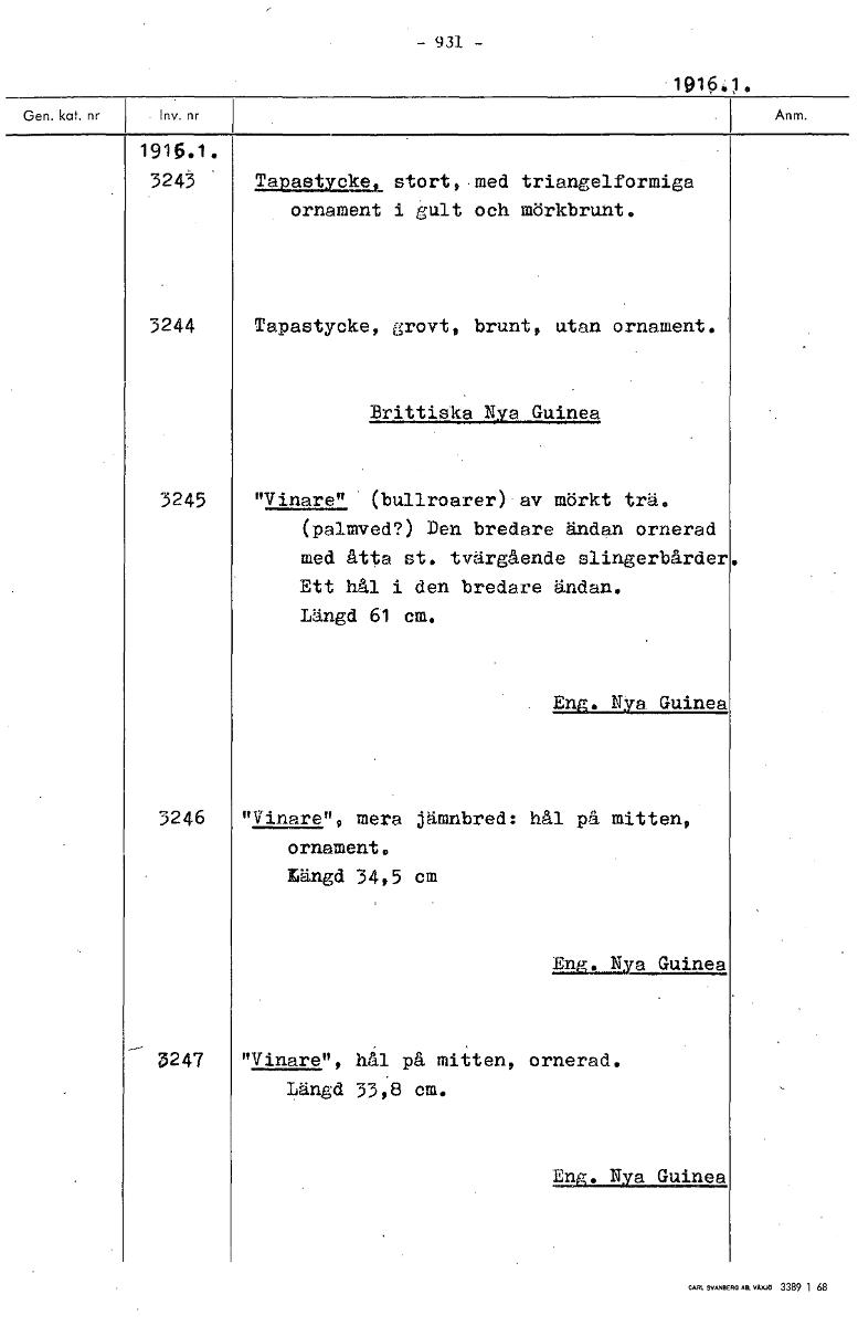 • 1916.1. 1916.1. 3243 TaRastycke. stort, med triangelformiga ornament i gult och mörkbrunt. 3244 Tapastycke, grovt, brunt, utan ornament. Brittiska Nya Guinea 3245 "Vinare" (bullroarer) av mörkt trä. (... Visa hela