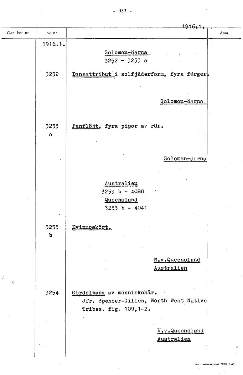 916,1, 1916..1. Solomon-öarna 3252 - 3253 a 3252 Dansattribut 'i solfjäderform, fyra färger Solomon-öarna. 3253 PanflöJt, fyra pipor av rör. a Solomon-öarna Australien 3253 b - 4088 Queensland 3253 b - 4041 3253 Kvinnoskört. b Ea12.2292119.12al Australien 3254 Gördelband av människohår. Jfr. Spencer-Gillen, North West Native Tribes. fig. 109,1-2. N.v.Queensland Australien [ocr]