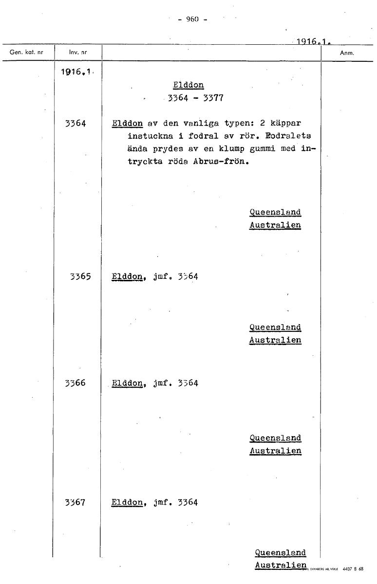 • 1916 e 1. 191601. Elddon 3364 - 3377 3364 Elddon av den vanliga typen: 2 käppar instuckna i fodral av rör. Rodralets ända prydes av en klump gummi med in- tryckta röda Abrusfrön. Queensland Australien... Visa hela