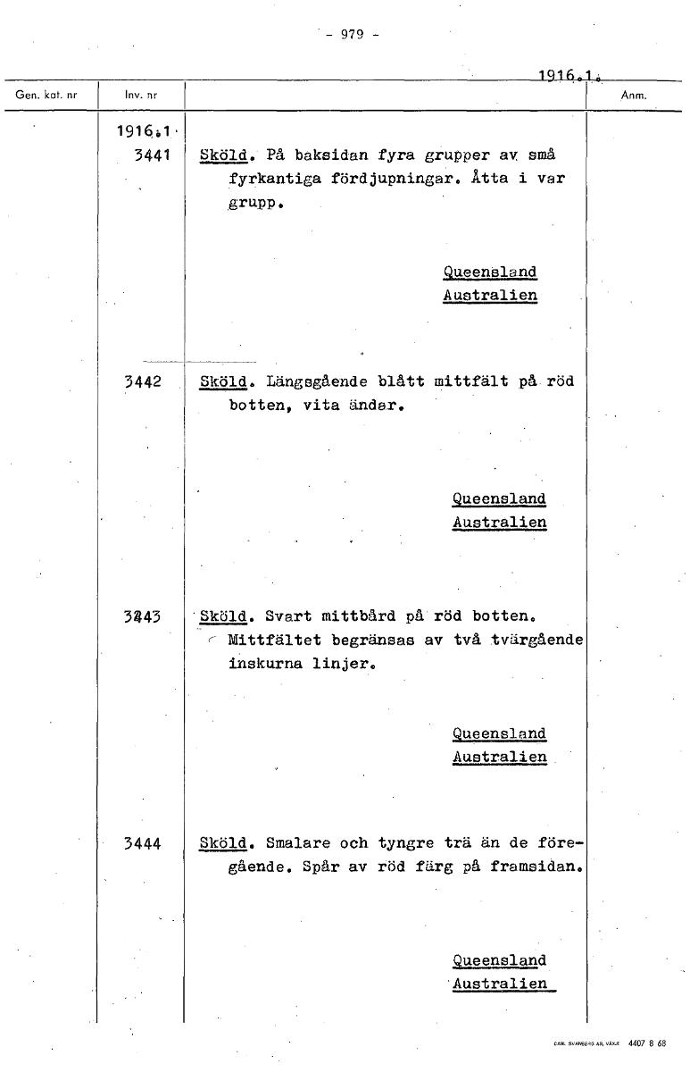 • 191641' 1916,t11• 3441 Sköld. På baksidan fyra grupper av små fyrkantiga fördjupningar. Åtta i var grupp. Queensland. Australien 3442 Sköld. Längsgående blått mittfält på röd botten, vita ändar. Queen... Visa hela