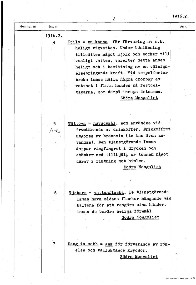 1916.2. 1916.2. 4 Djilo = en kanna för förvaring av s.k. heligt vigvatten. Under bönläsning tillsättes något mjölk och socker till vanligt vatten, varefter detta anses heligt och i besittning av en välsign- elsebringande kraft. Vid tempelfester bruka lamas hälla några droppar av vattnet i flata handen på festdel- tagarna, som därpå insupa detsamma. Södra Mongoliet 5 'båttova = huvudskål, som användes vid A-c, frambärande av drickoffer. Drickoffret utgöres av brännvin (te kan även an- vändas). Den tjänstgörande laman doppar ringfingret i drycken och stänker med tillhjälp av tummen något därav i riktning mot himlen. Södra Mongoliet 6 Ijebere = vattenflaska. De tjänstgörande lamas hava sådana flaskor hängande vi bältena för att rengöra sina händer, innan de beröra heliga föremål. Södra Mongoliet Sang in sabb = ask för förvarande av rök- else och välluktande kryddor. Södra .Mongoliet [ocr]Stäng