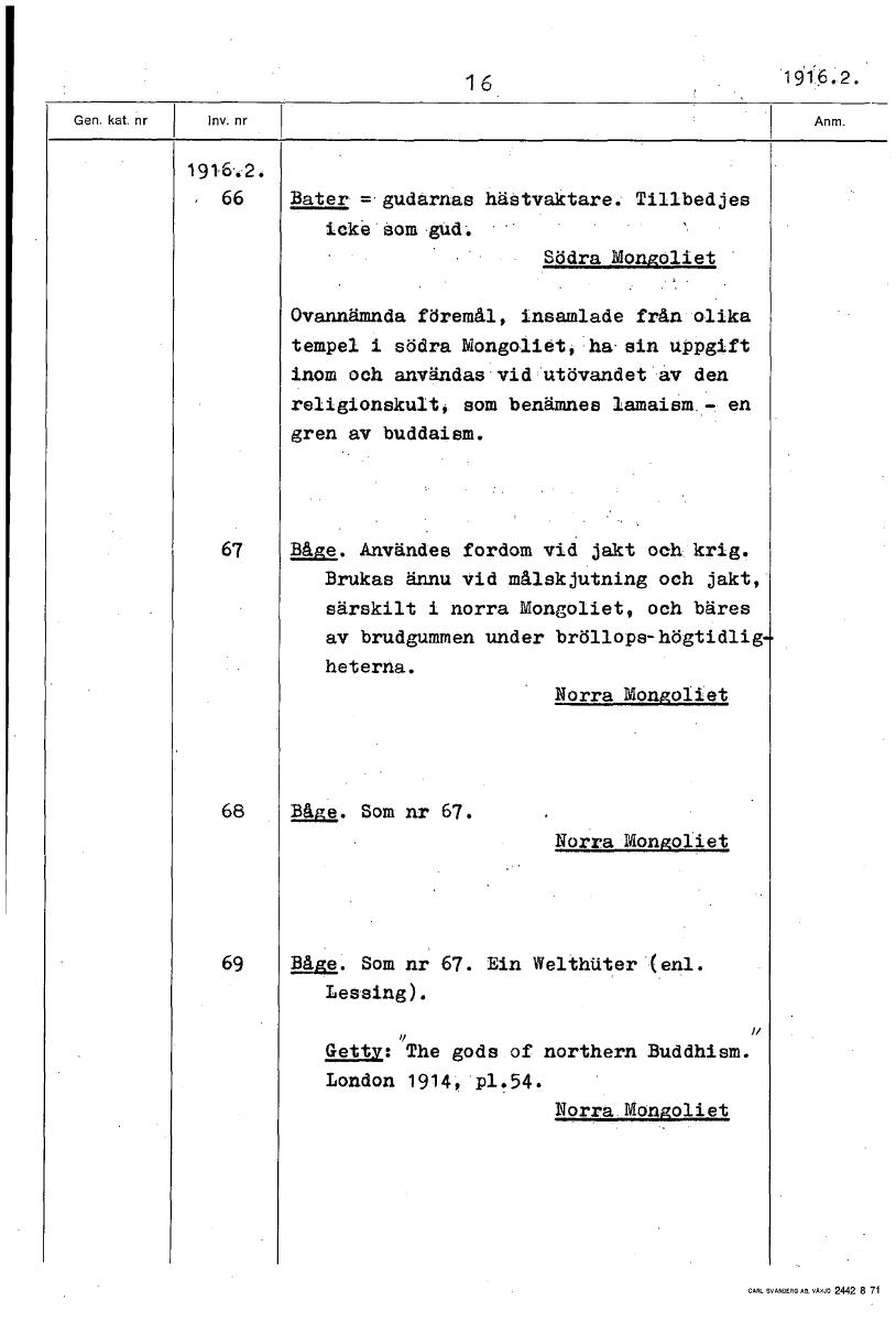 16 1916.2. 66 Bater --r-gudarnas häåtvaktare.. Tillbedjes icke'Somvid. Södra Mongoliet ' Ovannämnda föremål, insamlade från olika tempel i södra Mongoliet, ha sin uppgift inom och användas vid utövand...Visa hela