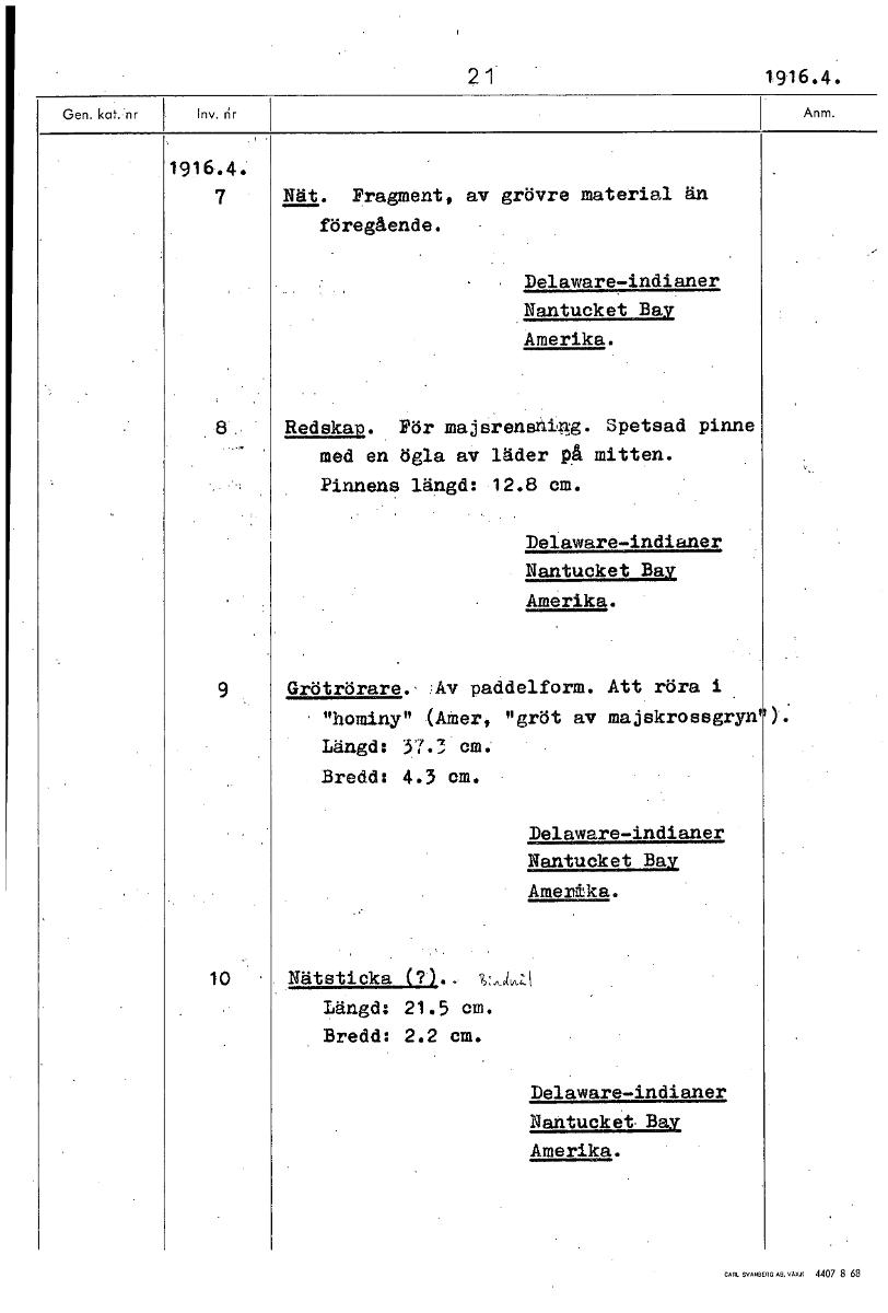 21 1916.4. 1916.4. Nät. Fragment, av grövre material än föregående. Delaware-indianer Nantucket Bay Amerika. Redskap. För majsrensnipg. Spetsad pinne med en ögla av läder på mitten. Pinnens längd: 12.8 cm. Delaware-indianer Nantucket Bas Amerika. Grötrörare.' ;Av paddelform. Att röra i "hominy" <Alter, "gröt av majskrossgryn' Längd: 37.3 cm: Bredd: 4.3 cm. Delaware-indianer Nantucket Bay Amerika. 10 Nätsticka (?).. 1,14 Längd: 21.5 cm. Bredd: 2.2 cm. Delaware-indianer Nantucket Bay Amerika. [ocr]Stäng