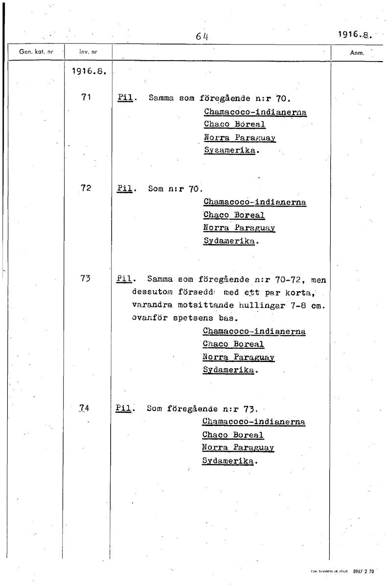 64 1916..8, 1916.8. 71 Pil. Samma som föregående n:r 70. Chamacoco-indianerna Chaco Böreal Norra Paraguay Sysamerika. 72 Pil. Som n:r 70. Chamacocå-indianerna Chaco Boreal Norra Paraguay _Sydamerika. ...Visa hela