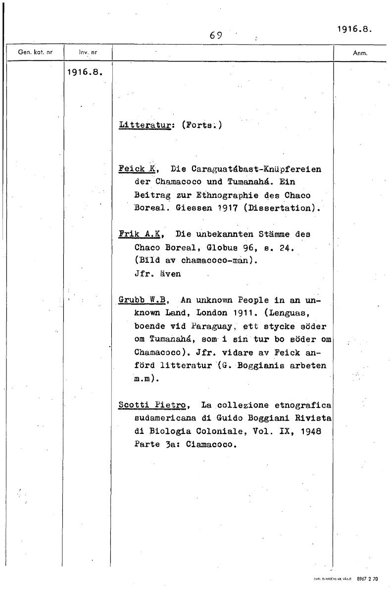 1916.8. 69 1916.8. Litteratur: Forts.) Feick K, Die Caraguatåbast-KnUpfereien der Chamacoco und Tumanahå. Ein Beitrag zur Ethnographie des Chaco Boreal. Giessen 1917 (Dissertation). Frik A.K, Die unbe...