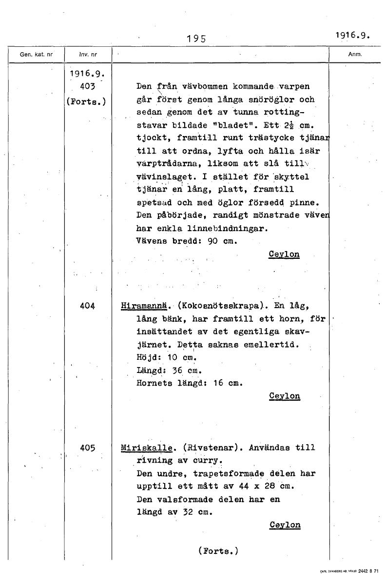 195 1916.9. 1916.9. 403 Den från vävbommen kommande varpen (Forts.) går först genom långa snöröglor och sedan genom det av tunna rotting- stavar bildade "bladet". Ett 21 cm. tjockt, framtill runt trästycke tjäna till att ordna, lyfta och hålla isär varptrådarna, liksom att slå till: vävinslaget. I stället för 'skyttel tjänar en lång, platt, framtill spetsad och med öglor försedd pinne. Den påbörjade, randigt mönstrade väve har enkla linnebindningar. Vävens bredd: 90 cm. Ceylon, 404 Hiramannä. (Kokosnötsskrapa). En låg, lång bänk, har framtill ett horn, för insättandet av det egentliga skav- järnet. Detta saknas emellertid. Höjd: 10 cm. Längd: 36 cm. Hornets längd: 16 cm. Ceylon 405 Miriskalle. (Rivstenar). Användas till rivning av curry. Den undre, trapetsformade delen har upptill ett mått av 44 x 28 cm. Den valsformade delen har en längd av 32 cm. Ceylon (Forts.) [ocr]
