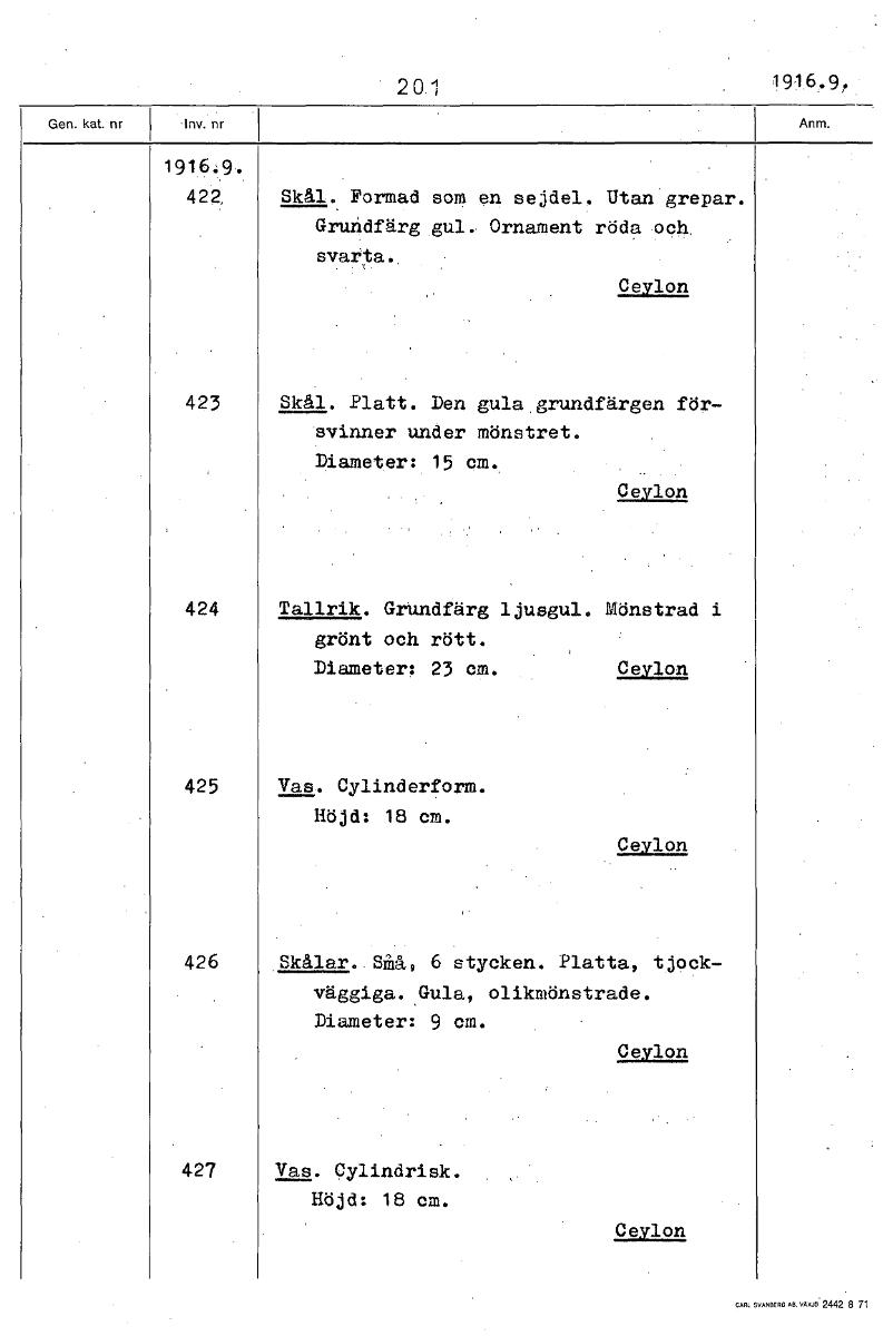 • 2 0 1 191.6.9. 1916.9. 422, Skål. Formad som en sejdel. Utan grepar. Guridfärg gul. Ornament röda och, svarta.. Ceylon 423 Skål. Platt. Den gula grundfärgen för- svinner under mönstret. Diameter: 15 c... Visa hela