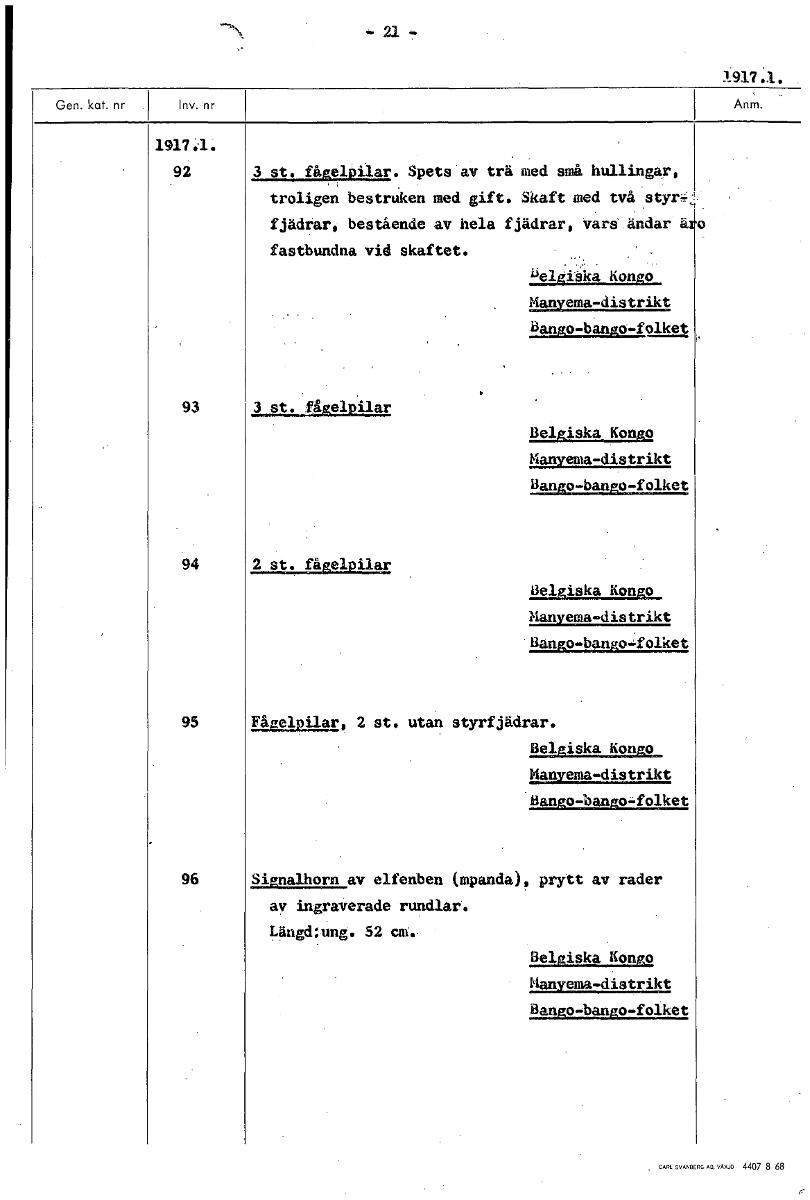 1917.1. 92 3 st. fågelpilar. Spets av trä med små hullingar, troligen bestruken med gift. Skaft med två styr- fjädrar, bestående av hela fjädrar, vars ändar ä fastbundna vid skaftet. belgiska Kongo Manyema-distrikt Bano-bananolket 93 3 st. ;fågelpilar Belgiska Kongo Manyema-distrikt Bango-bango-folket 94 2 st. fågelpilar Belgiska Kongo Manyema-distrikt Bango-bango-folket 95 Fågelpilar, 2 st. utan styrfjädrar. Belgiska Kongo Manyema-distrikt äpyo-Mango-folket 96 Signalhorn av elfenben (milanda), prytt av rader av ingraverade rundlar. Längdtung. 52 cm. Belgiska Kongo Manyema-distrikt Bango-bango-folket [ocr]