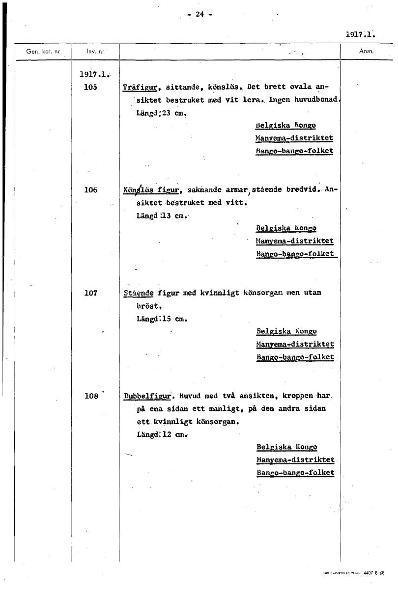 -24-- 1917.1.- 105 Träfigur, sittande, könslös& Det brett ovala an- siktet bestruket med vit lera.. Ingen huvudbonad. Längd:23 cm. Belgiska Kongo Manyema-distriktet Bango-bango-folket 106 Kölös figur, saknande armar, stående bredvid. An- siktet bestruket med vitt. Längd .13 cm. Belgiska Kongo Manyema-distriktet Bango-bango-folket 107 Stående figur med kvinnligt könsorgan men utan bröst. Längd:15 cm. Belgiska Kongo Manyema-distriktet Bango-bango-folket 108 Dubbelfigur. huvud med två ansikten, kroppen har på ena sidan ett manligt, på den andra sidan ett kvinnligt könsorgan. Längd:12 cm. Belgiska Kongo Manyema distriktet Bango-bango-folket [ocr]