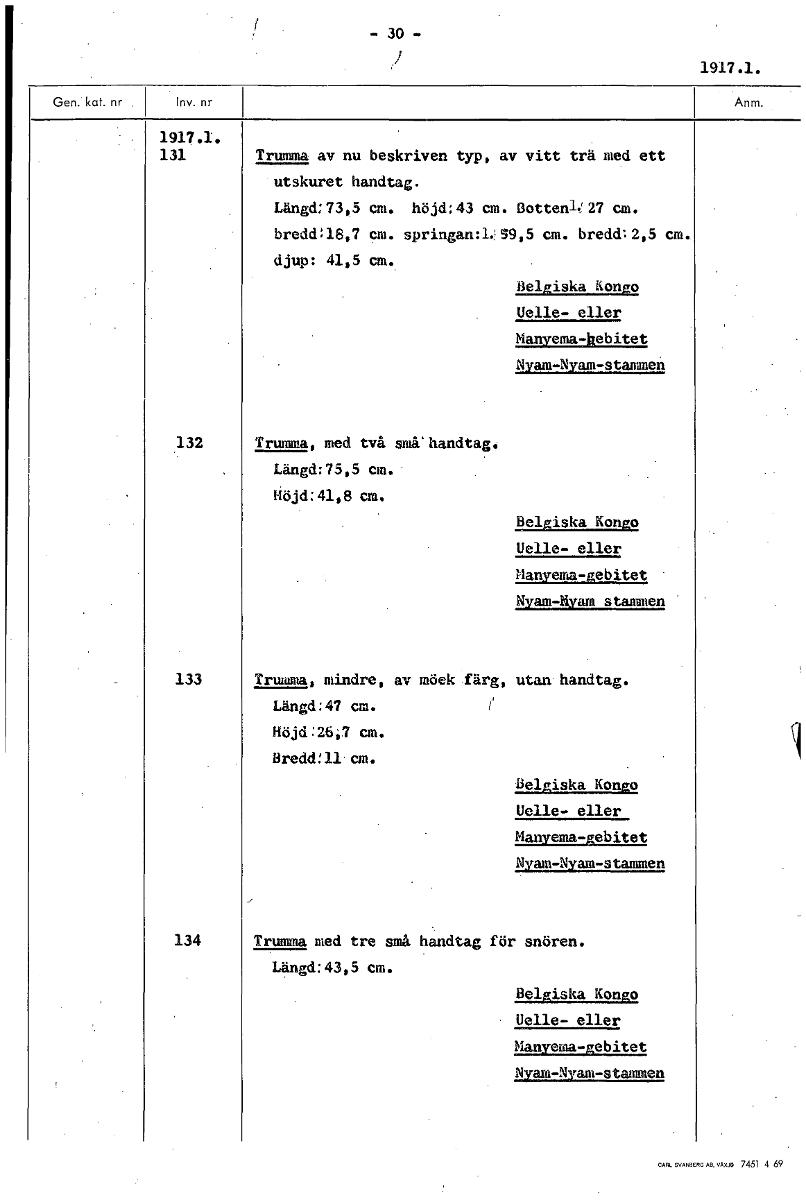 • -30- 1917.1. 1917.1. 131 Trumma av nu beskriven typ, av vitt trä med ett utskuret handtag. Längd:73,5 cm. höjd:43 cm. Botten4"27 cm. breddU8,7 cm. springan:1.'59,5 cm. bredd:2,5 cm. djup: 41,5 cm. Bel... Visa hela